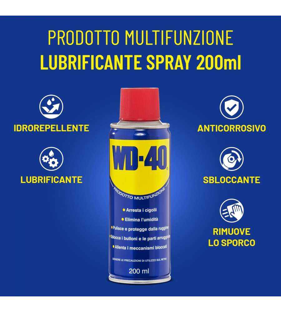 Spray multiuso WD-40 da 200 ml: lubrificante, sbloccante e anticorrosivo. Rimuove macchie di grasso e catrame, elimina l'umidità e previene la ruggine. Facile applicazione per una pulizia e protezione durature delle superfici metalliche.Confezione: