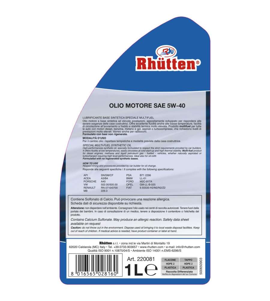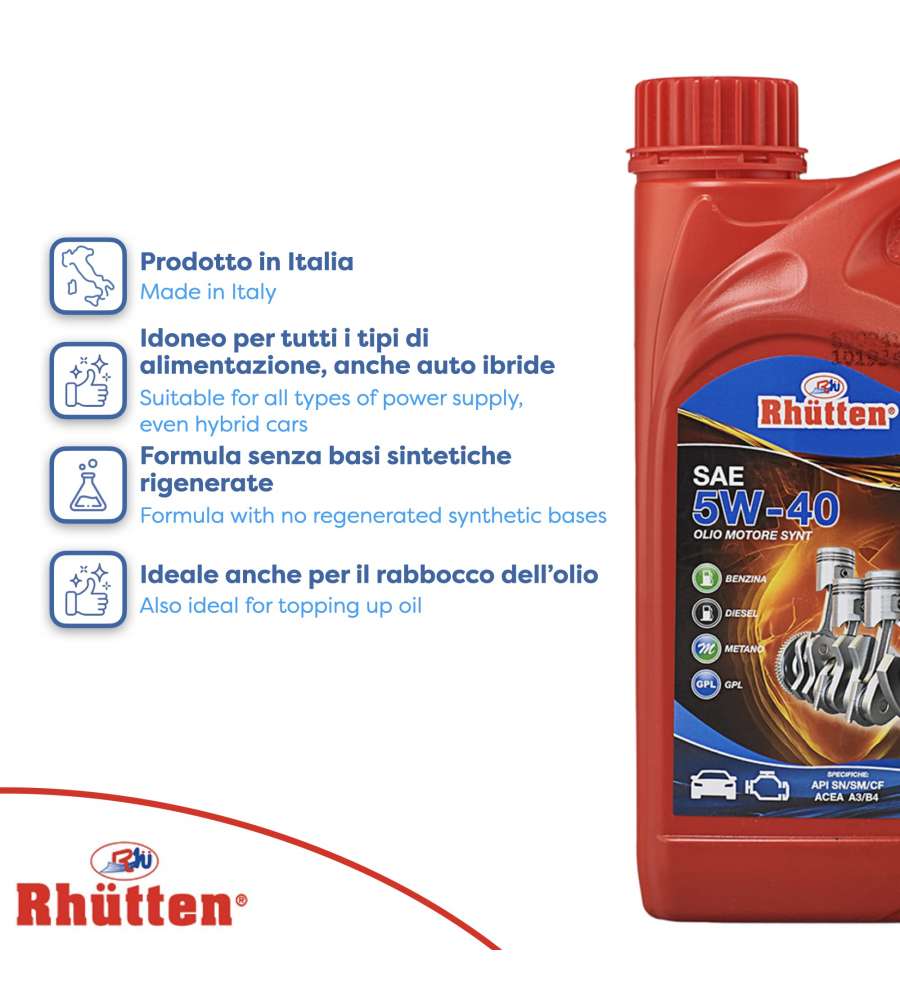 Descrizione: Olio motore Rhutten 5W-40, semi-sintetico, 1L. Garantisce prestazioni superiori e protezione del motore. Prodotto multifuel per tutte le auto con motori diesel, benzina, metano e gpl, aspirati o turbocompressi. Compatibile con motori moderni.