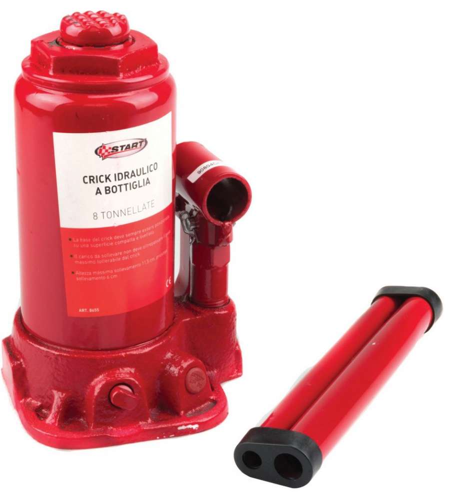 Il crick idraulico a bottiglia della linea start è un resistente vano elevatore in ferro dalla sruttura compatta capace di sollevare un peso massimo di 8 tonellate.Altro 1: