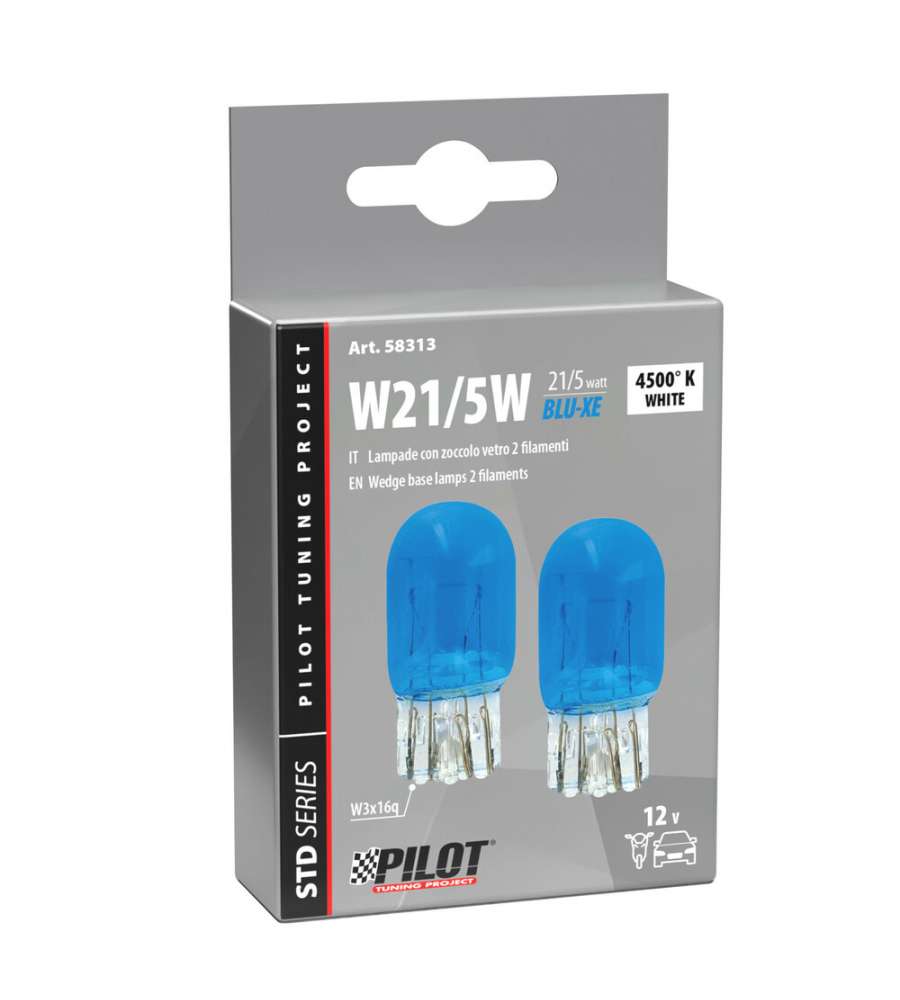 Lampada 12V LAMPA con zoccolo in vetro Blu-Xe, 2 filamenti W21/5W, attacco W3x16q. Progettata per durare, realizzata con materiali di alta qualità e prestazioni.Watt:
