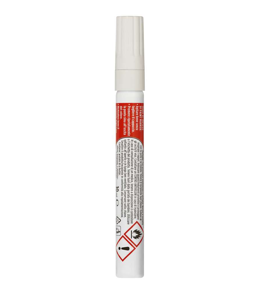 Pennarello indelebile bianco con ottima copertura su superfici scure. Resistente agli agenti atmosferici, ideale per uso interno ed esterno. Utilizzabile su legno, metallo, plastica e cartone. Colore durevole e inalterato nel tempo.Applicazione: