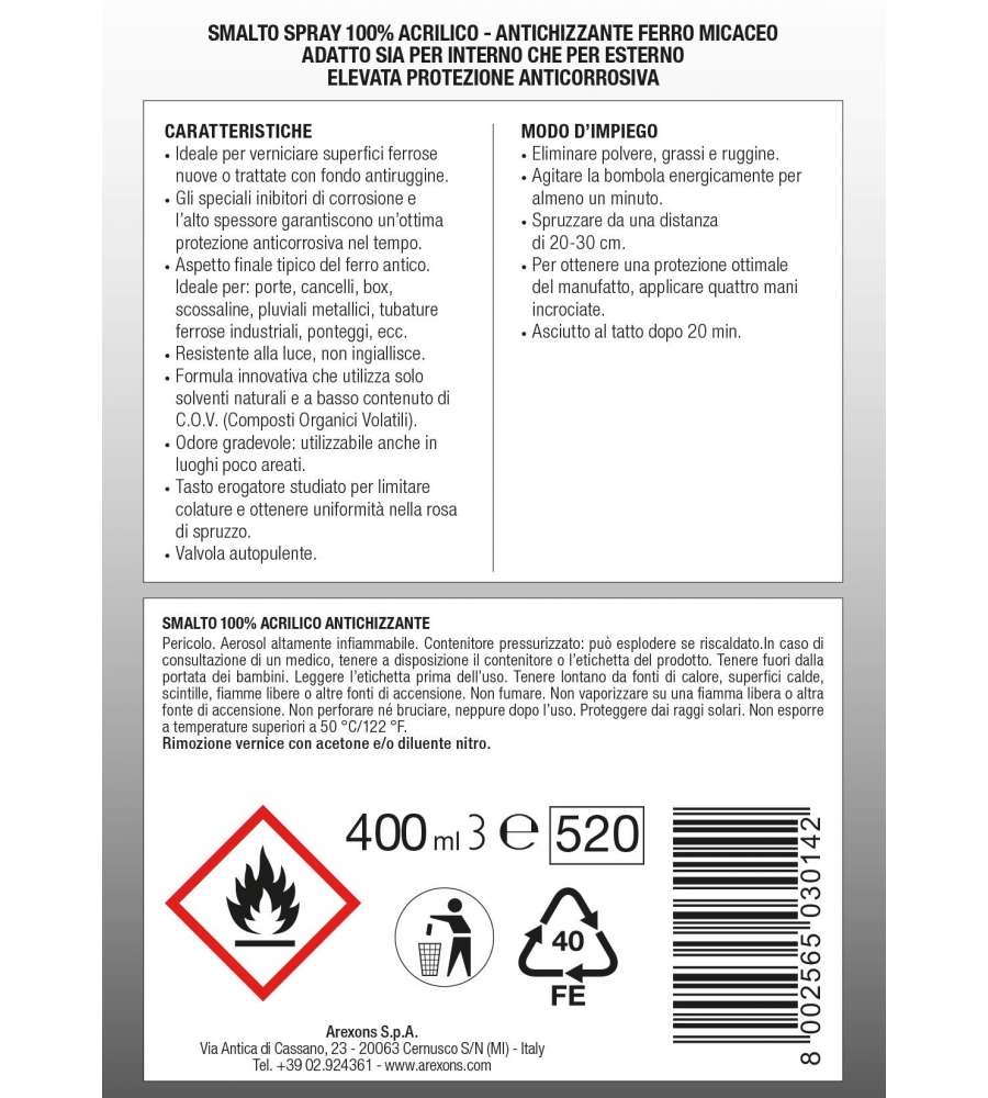 Descrizione: Smalto spray antichizzante bronzo Arexons, ideale per interni ed esterni. Rapida essiccazione, finitura resistente a graffi e intemperie. Valvola autopulente e sovraverniciabile per risultati perfetti.