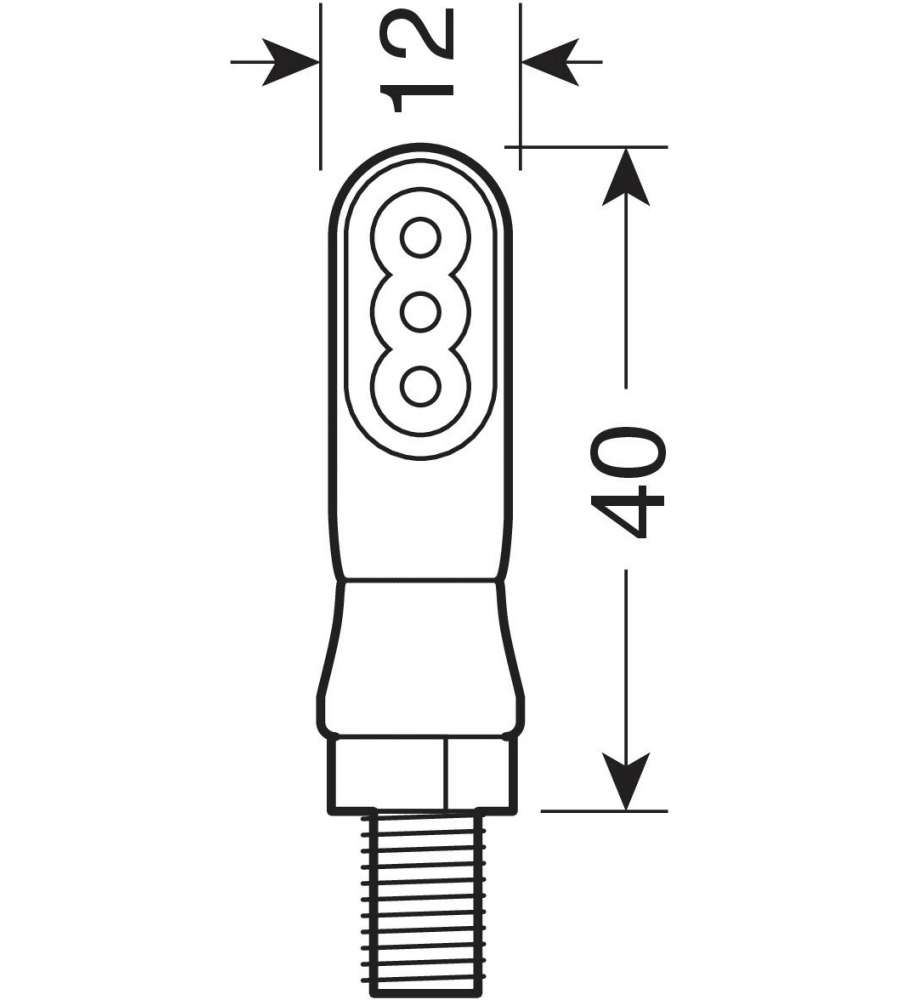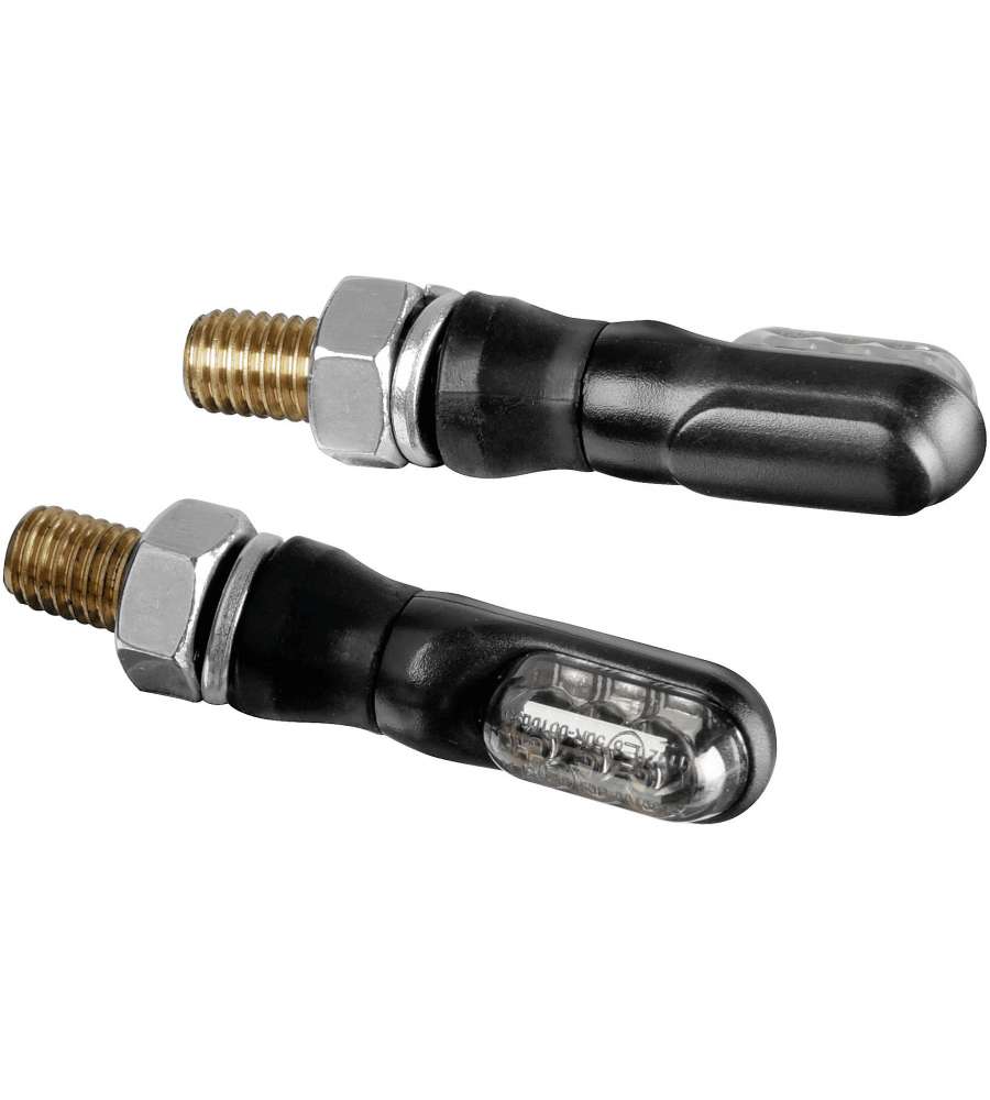 Indicatori di direzione a LED per moto 12V, omologati E. Dimensioni compatte 35x18 mm, lente fumè con luce arancio. Cavi con connettori rapidi per installazione semplice, alta resistenza alle vibrazioni. Impermeabile e robusto.Volt: