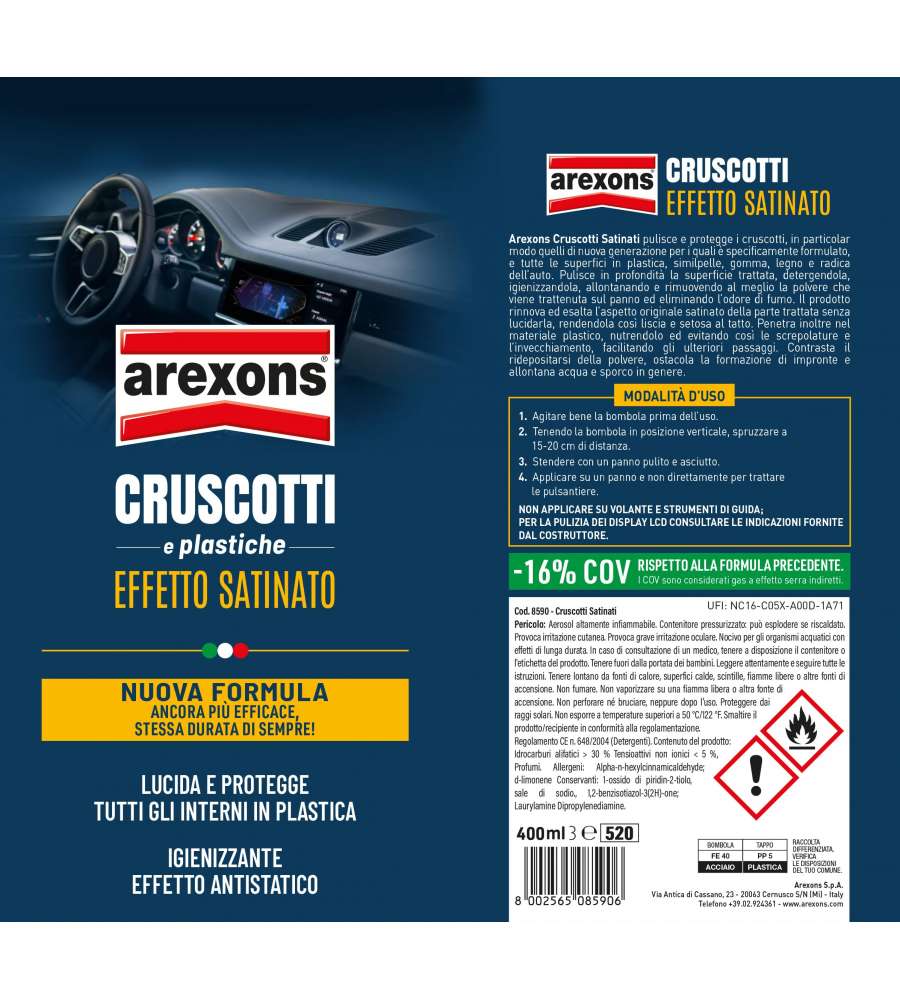 Descrizione: Rinnova e proteggi cruscotti e superfici in plastica con AREXONS Cruscotti Effetto Satinato 400ml. Formula innovativa, profumazione fresca, effetto setoso al tatto, facile applicazione.