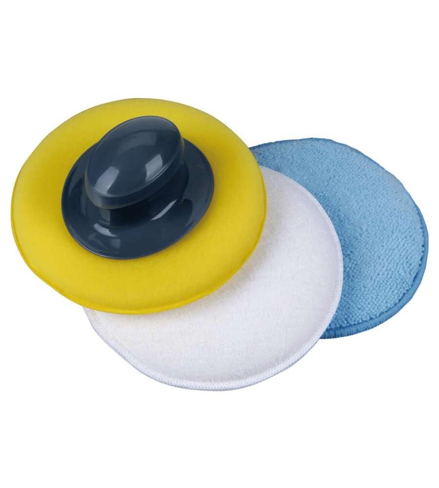 Impugnatura ergonomica con 3 cuscinetti intercambiabili per applicazione cera auto. Cuscinetto blu per applicare, giallo per stendere e bianco per lucidare. Ideale per una pulizia completa e senza sporcare le mani. Diametro 130 mm.Altro 1: