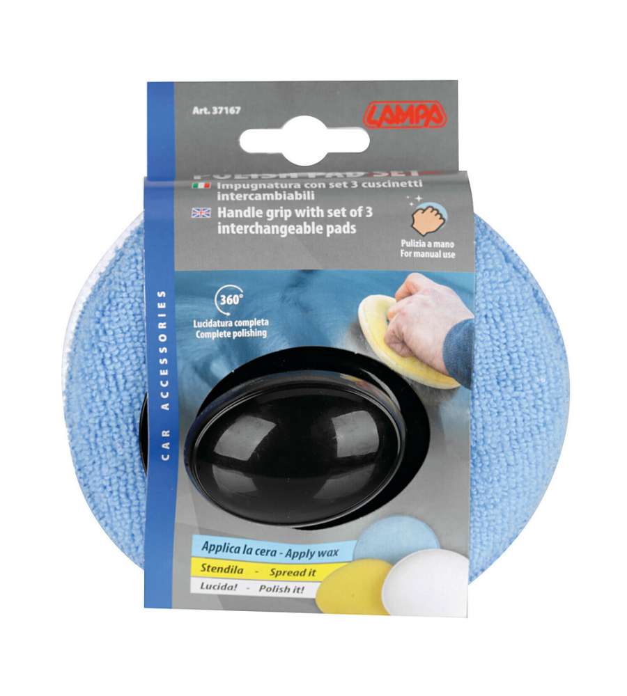Descrizione: Scopri l'Impugnatura Lampa con 3 cuscinetti intercambiabili (Ø 130 mm) per una pulizia auto impeccabile. Applica, stendi e lucida la cera senza sporcarti le mani. Risultati professionali garantiti!