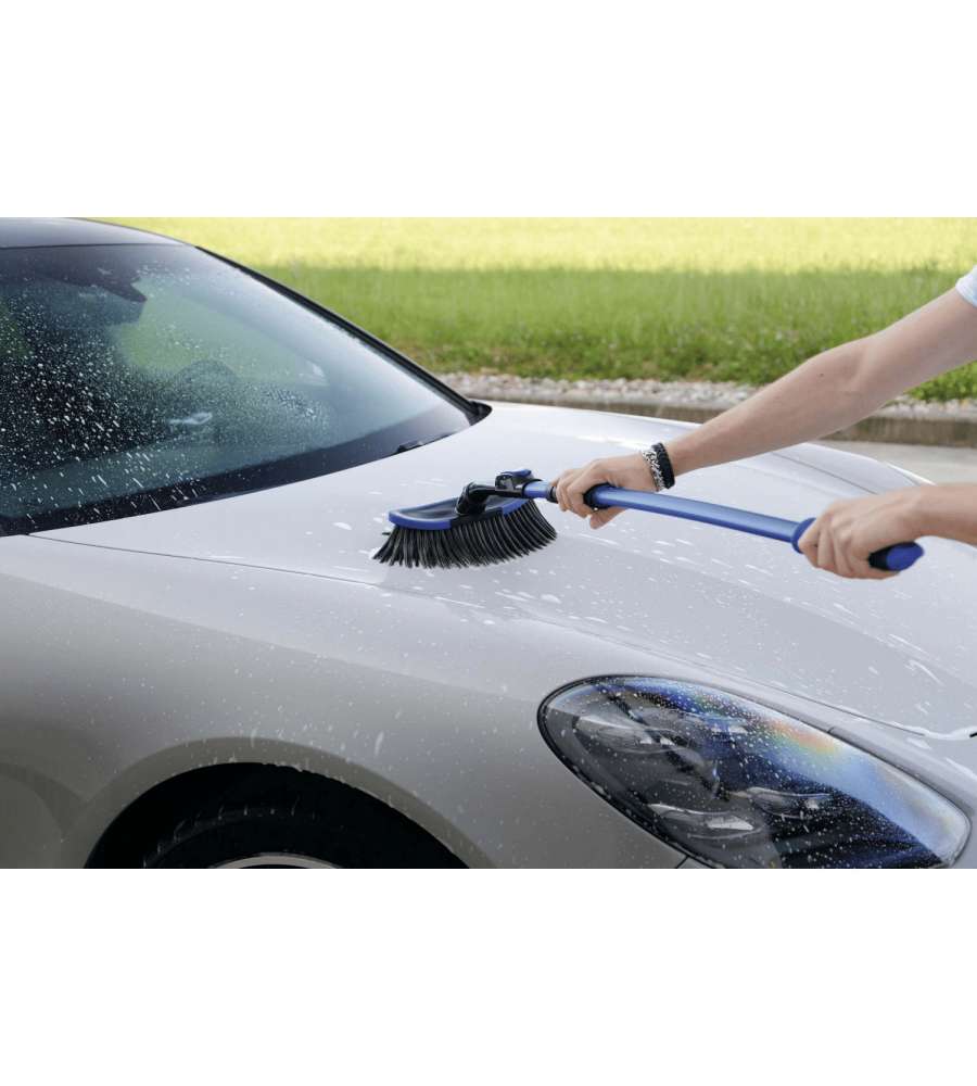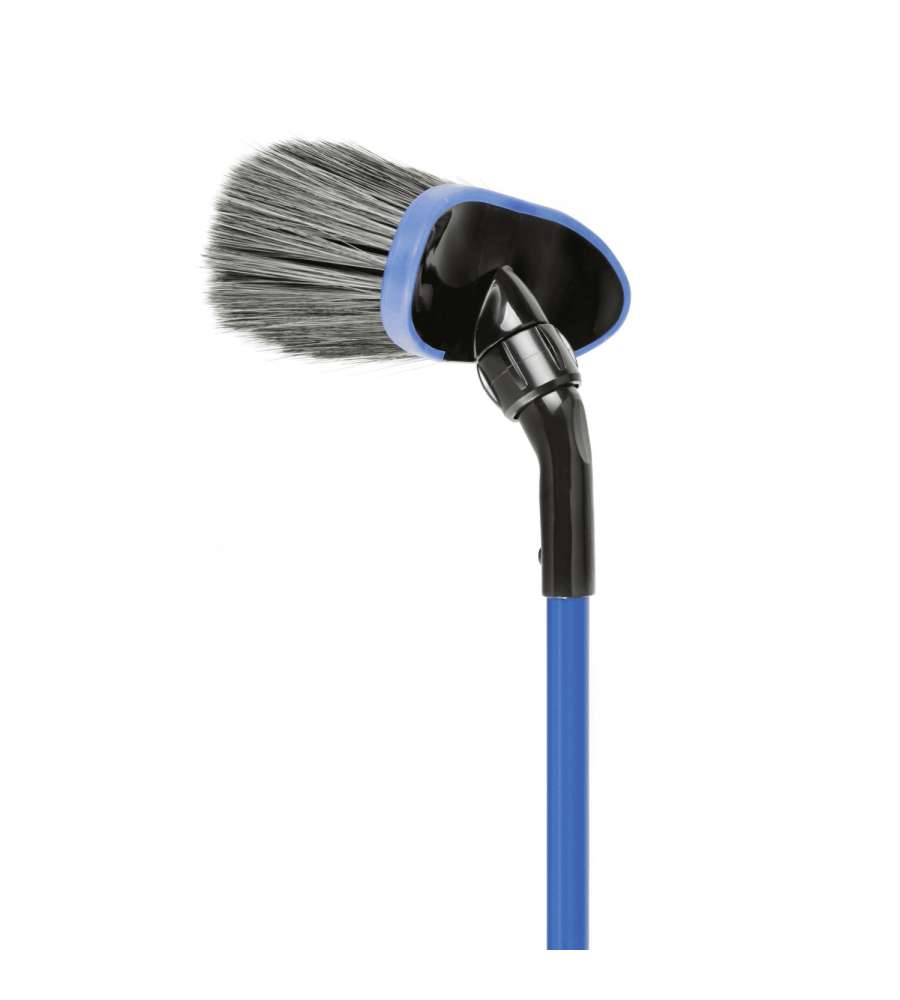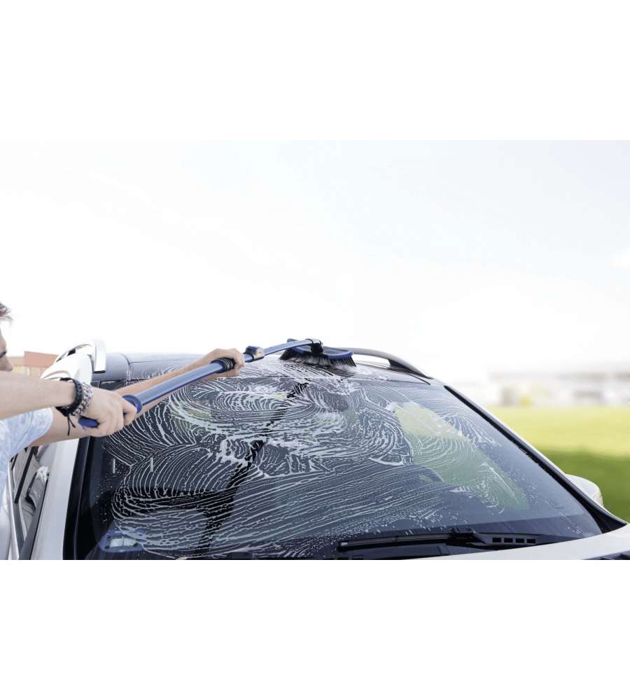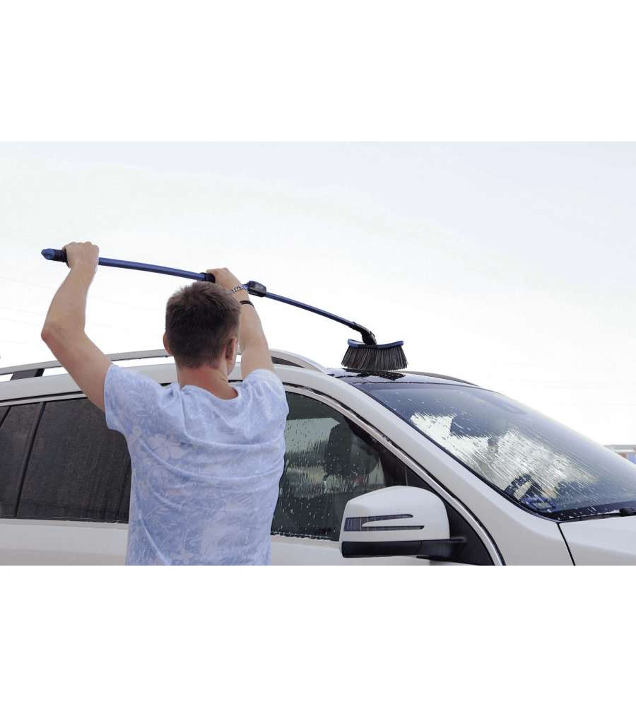 Spazzola telescopica in alluminio (102-155 cm) per lavaggio veicoli alti, con setole antigraffio in polibutilene tereftalato e impugnature in gommaschiuma anti-scivolo. Design ergonomico e curvatura per un utilizzo pratico ed efficace.Garanzia: