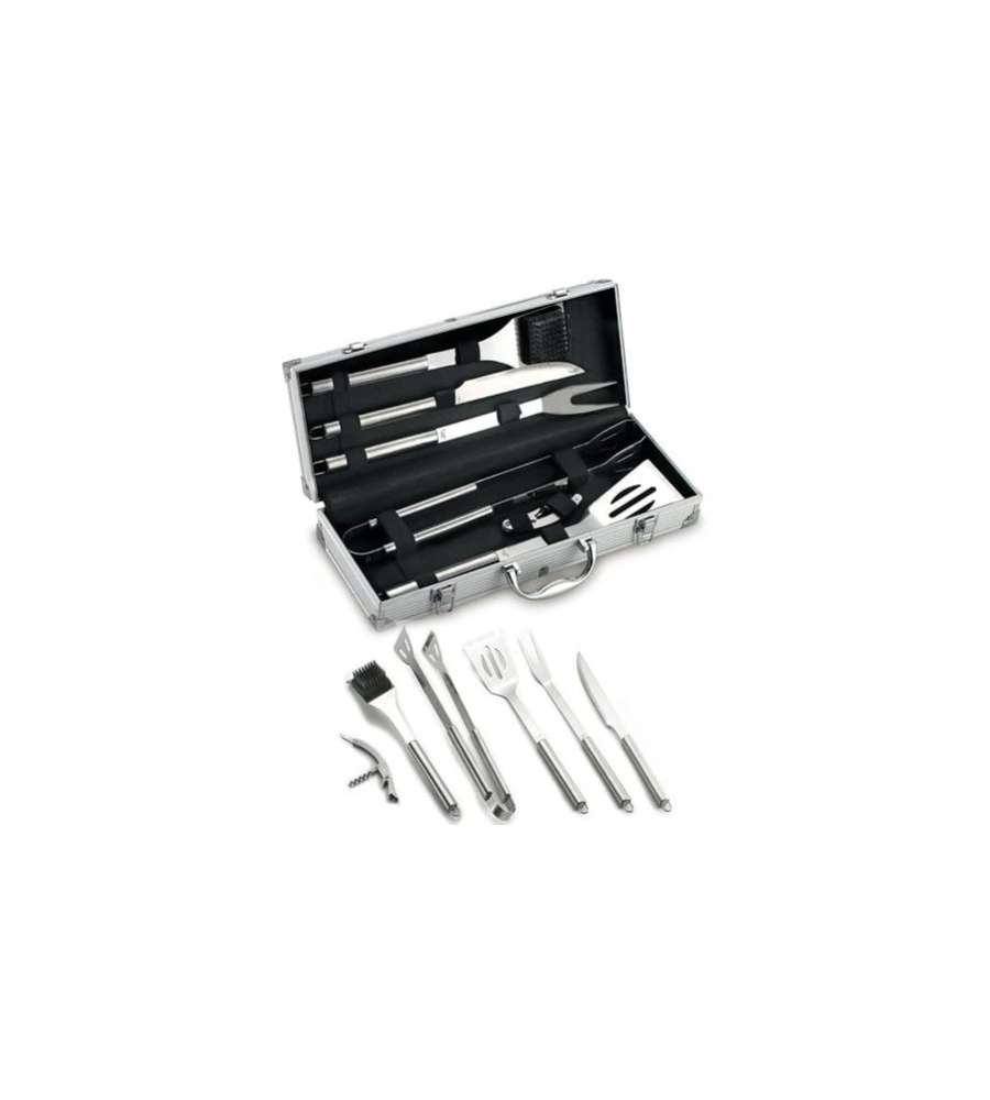Set valigetta barbecue: 6 accessori in acciaio inox (cavatappi, spazzola, pinza, paletta, forchettone, coltello 42 cm), custodia in alluminio, peso 1,7 kg.