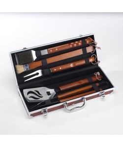 Set valigetta barbecue: 5 accessori in acciaio inox (spazzola, paletta, pennello, forchettone, pinza) da 43 cm con manico in legno massello. Valigetta in radica.