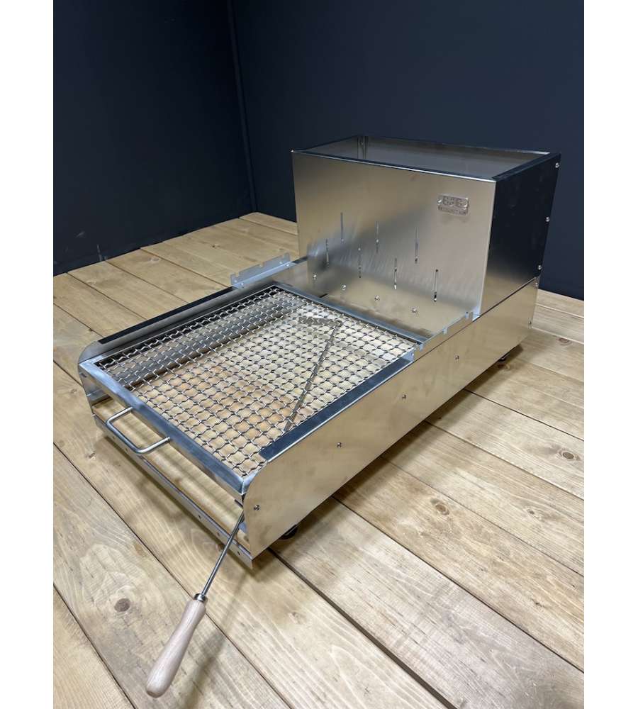 Griglia a maglia con maniglia 50x50 Inox. Tirabrace acciaio e legno di 80cm. Braciere in tondo inox da 12. Bulloneria inox. Piedini in gomma di 30mm antiscivolo. Piano in tavelle refrattarie di 50x20x3 cm (N. 4)Caratteristiche: