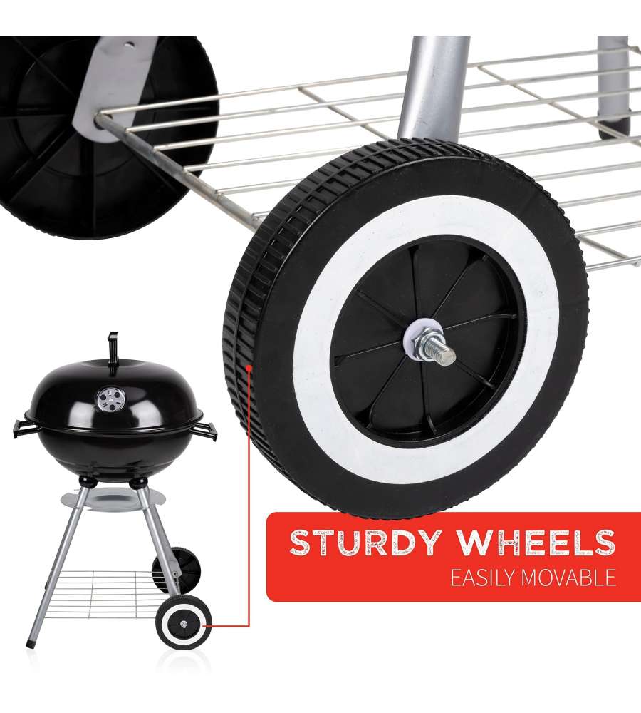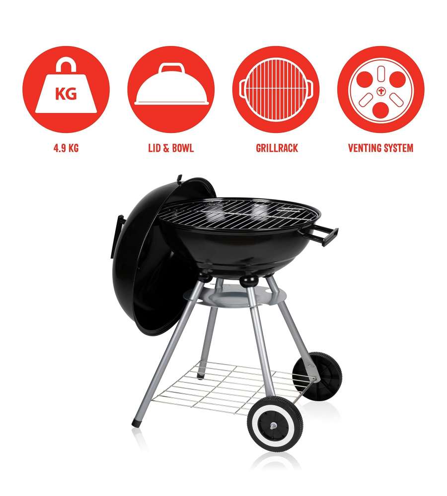 Barbecue tondo con struttura in acciaio, griglia cromata di 45 cm, sfiato regolabile, vassoio per grassi e ripiano in metallo. Dotato di ruote per un facile spostamento, ideale per cotture all'aperto. Peso 5,04 kg.Dimensioni area cottura: