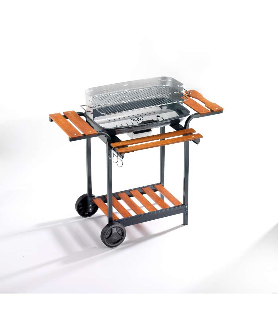 Barbecue Ompagrill 50-25 Green W: a carbonella, carrello integrato, griglia acciaio cromato regolabile 4 posizioni, paravento, braciere e reggibrace in acciaio verniciato, ripiani in legno massello.Dimensioni area cottura: