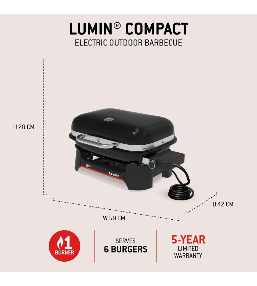 Barbecue elettrico Lumin Compact di Weber, raggiunge oltre 315 °C, versatile per rosolare, affumicare, cuocere a vapore. Compatto, facile da riporre, con area di cottura di 1166 cm² e peso di 12 kg. Include termometro integrato e cavo da 1.8 m.Materiale griglia: