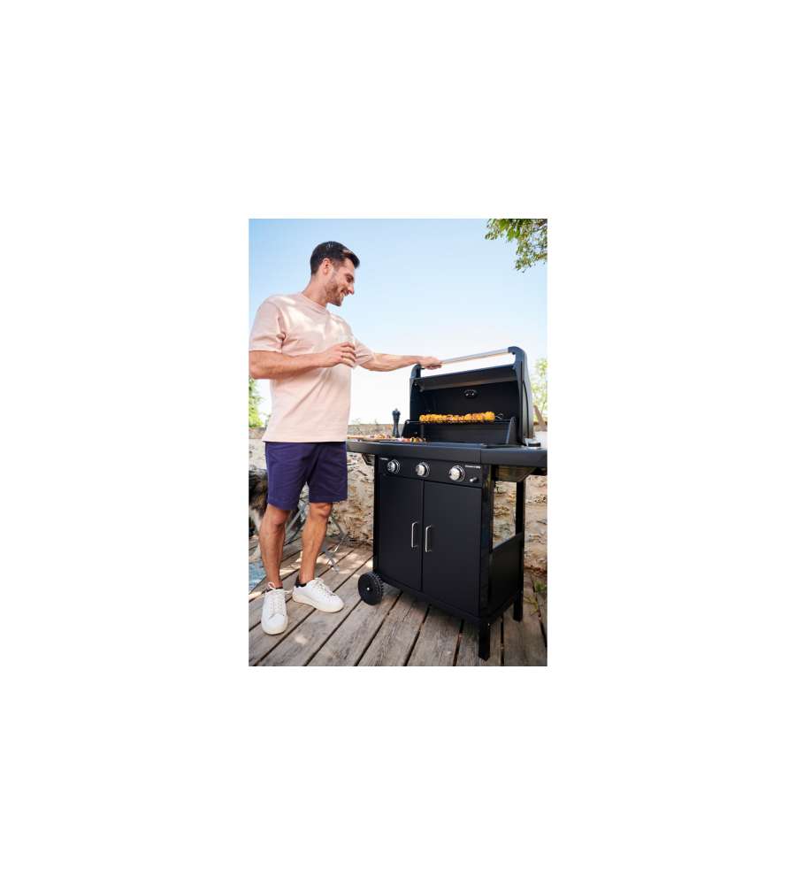 Barbecue a gas GPL Compact 3 LS: 7500W, 3 bruciatori in acciaio, dimensioni 108x53x108 cm, ruote fisse, coperchio con termometro, vaschetta raccogli grasso, riduce fiammate, ideale per 8-10 persone.Larghezza griglia: