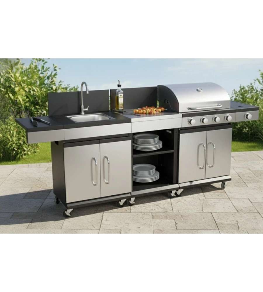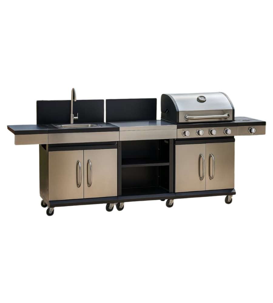 Barbecue, 4 fuochi, fornello laterale, lavello, armadietto porta bombola, ripiano da lavoroCaratteristiche: