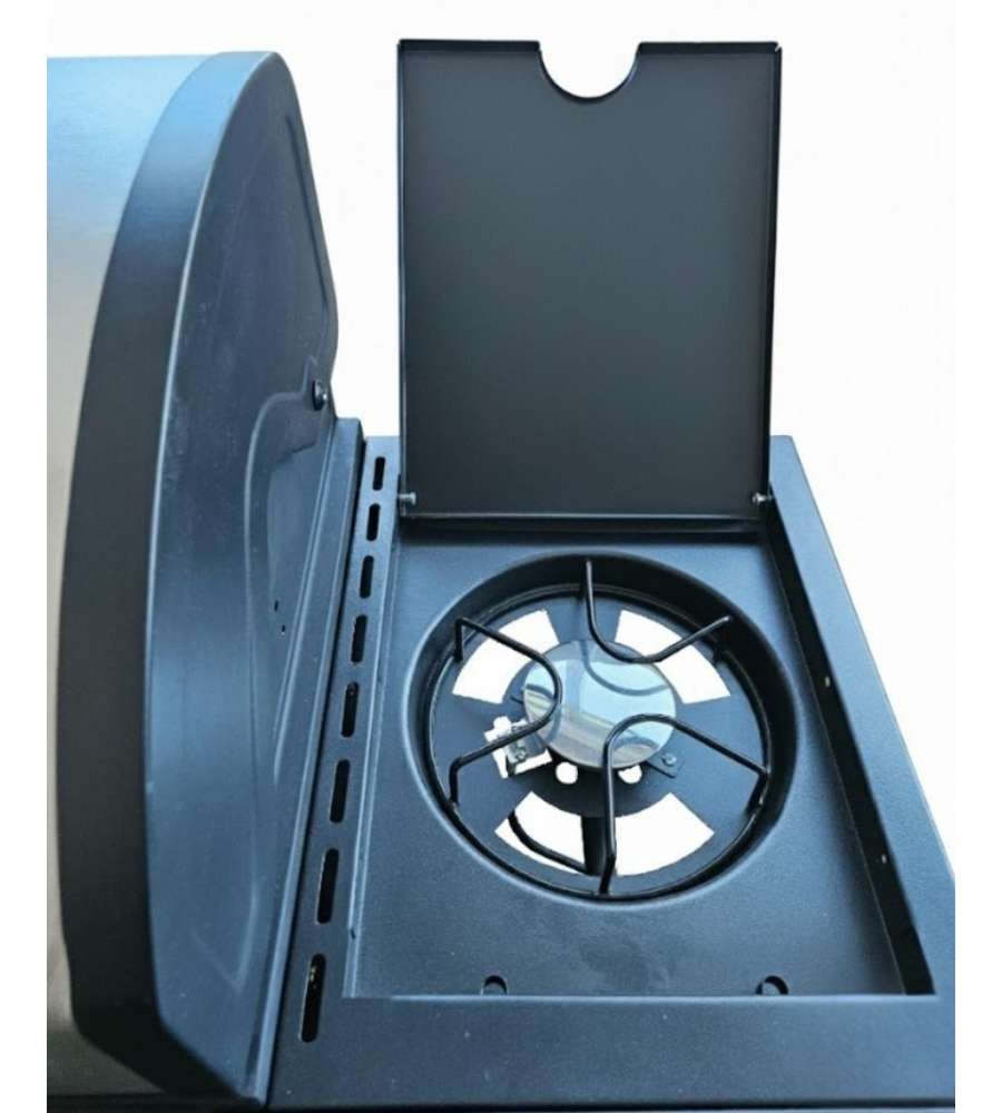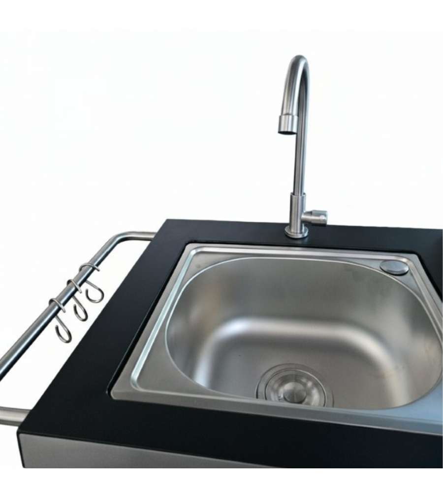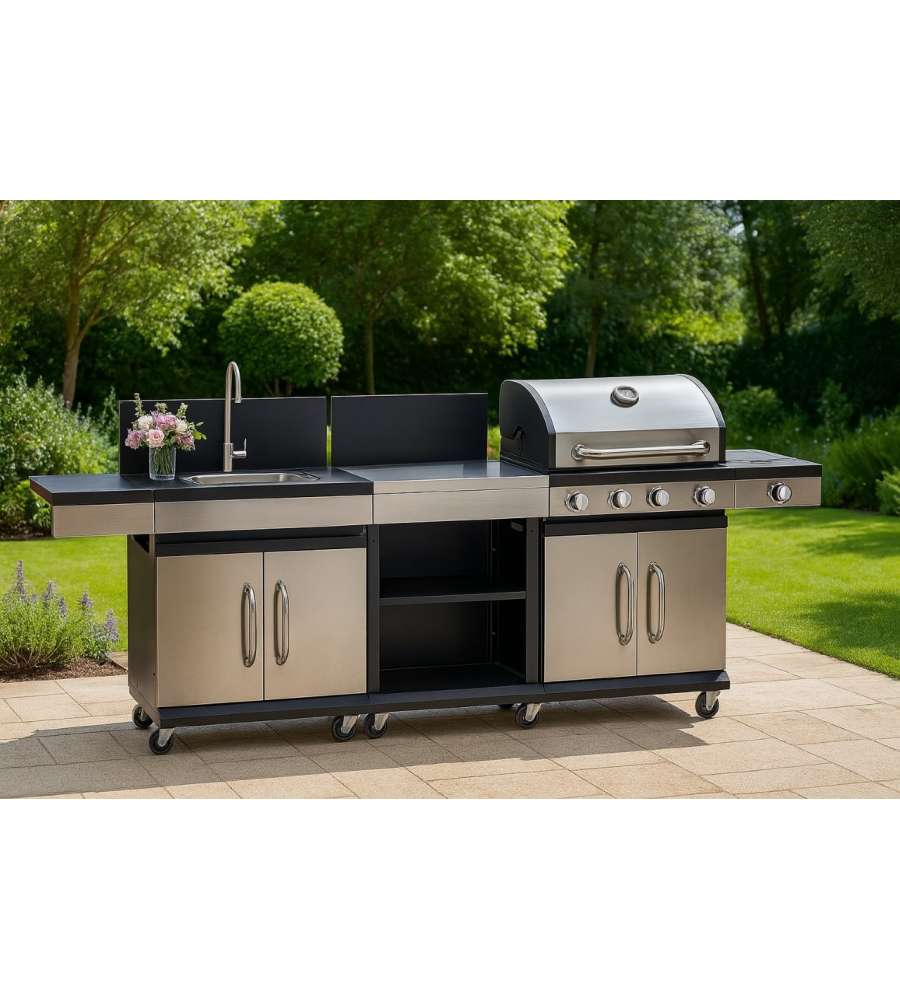 Cucina completa a gas con barbecue, 4 fuochi e fornello laterale. Armadietto porta bombola e oggetti, lavello con rubinetto, ripiano da lavoro con mensole aperte. Struttura in antracite e inox. Area da cucina: 61,5x37,5 cm. Lavello: 37,5x32 cm.Dimensioni area cottura: