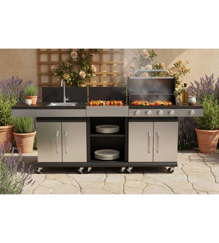 La cucina a gas Artemisia è la soluzione perfetta per chi ama cucinare all'aperto. Con il suo design elegante in antracite e acciaio inox, non solo offre funzionalità ma si integra perfettamente con l'ambiente esterno. Grazie ai suoi 4 fuochi e al fornello laterale, puoi preparare diversi piatti contemporaneamente, mentre il barbecue ti permette di grigliare carne, pesce e verdure per deliziare i tuoi ospiti. Il lavello, completo di rubinetto, rende facile la pulizia e la preparazione degli ingredienti. Con l'armadietto porta bombola e il ripiano da lavoro, avrai tutto il necessario a portata di mano per un'esperienza di cottura senza stress.