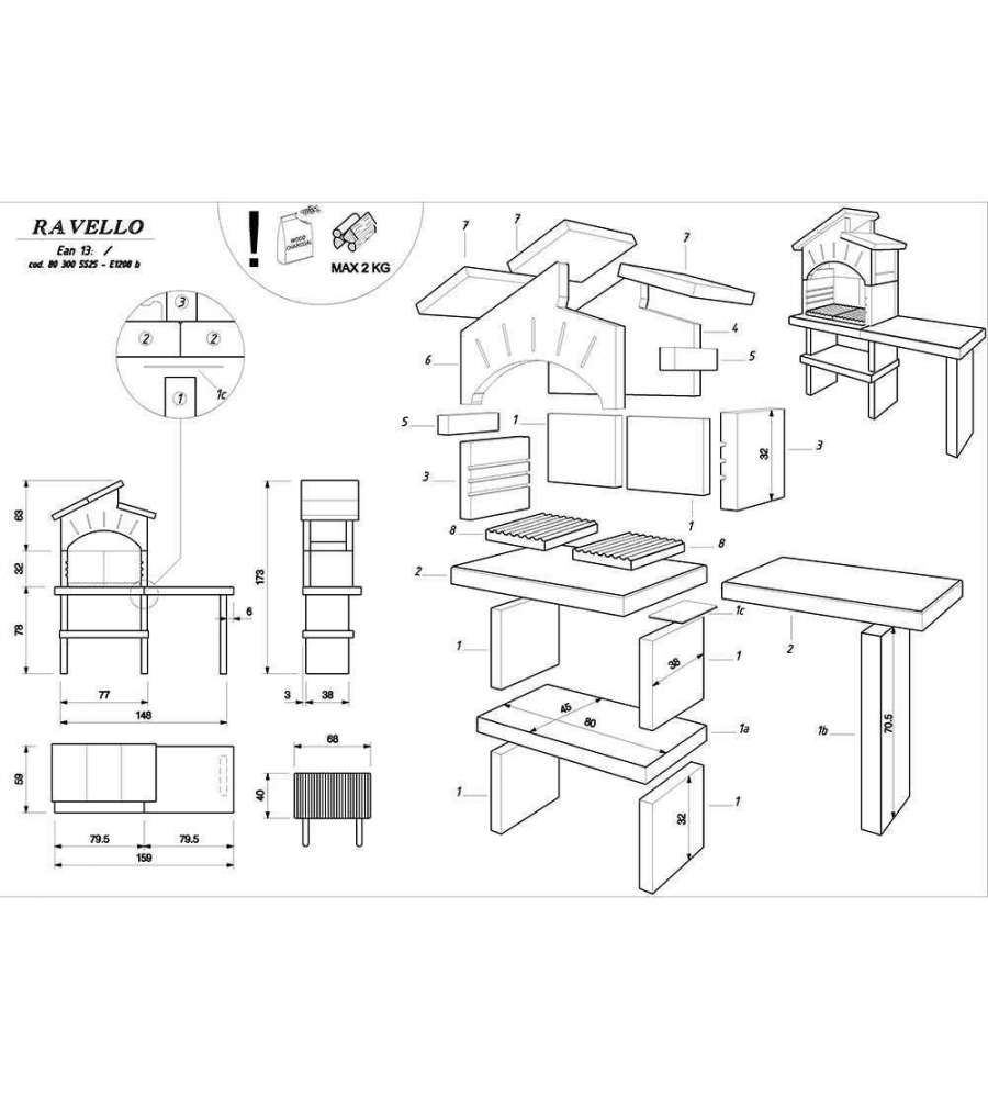 Barbecue in muratura Ravello: struttura in conglomerato cementizio refrattario e granulati di marmo, griglia regolabile 68x40 cm, dimensioni 166x59x173h cm, peso 480 kg. Cottura a carbone e legna.I dati sottostanti riguardano la sede legale e le Informazioni correlate del produttore del prodotto.