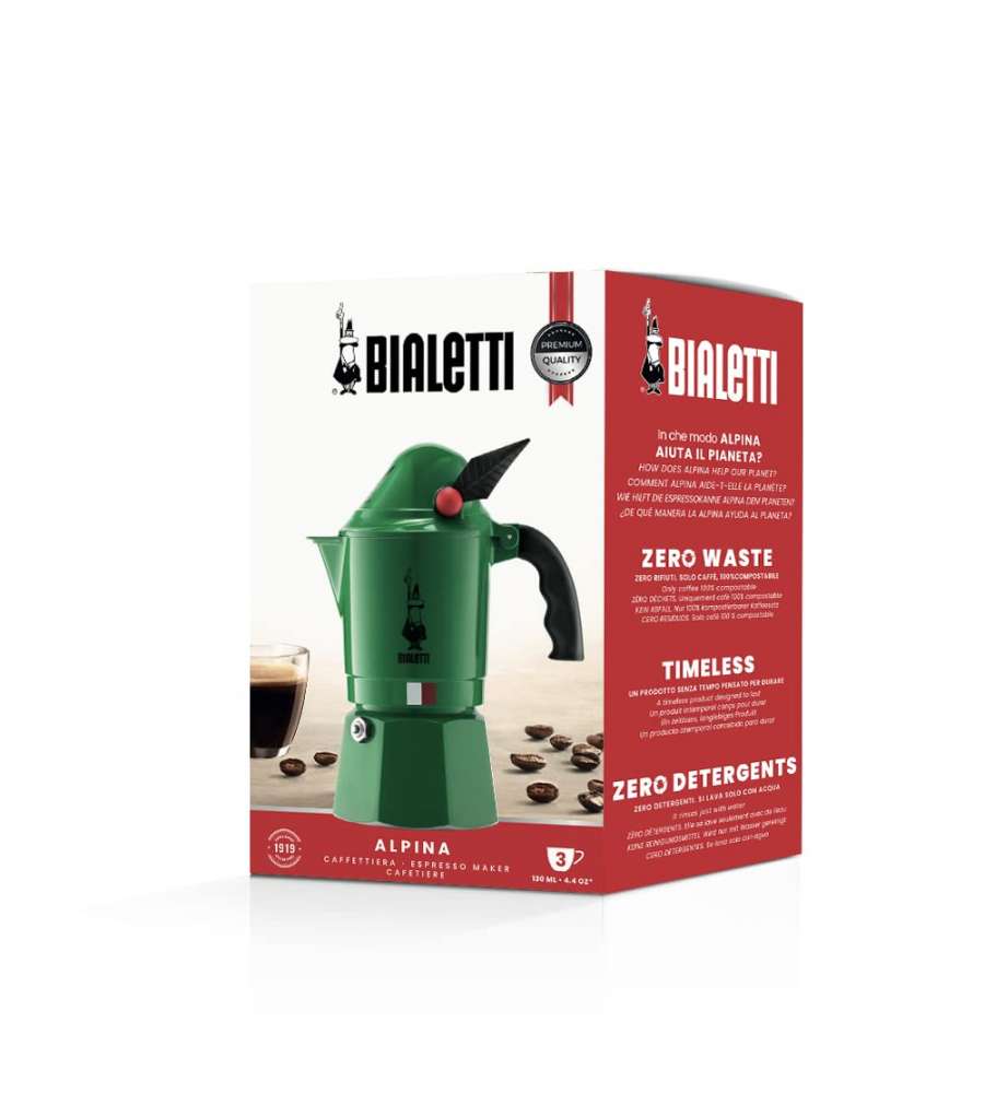Descrizione: Caffettiera Moka Alpina Tz 3 Bialetti in alluminio, manico ergonomico e valvola di sicurezza. Design unico ispirato agli Alpini, per un caffè autentico e gustoso. Perfetta per 3 tazze.