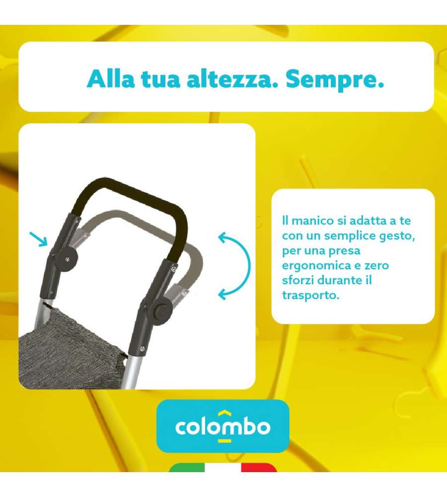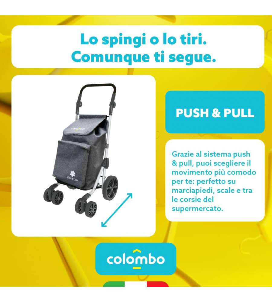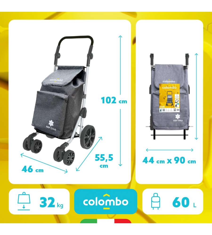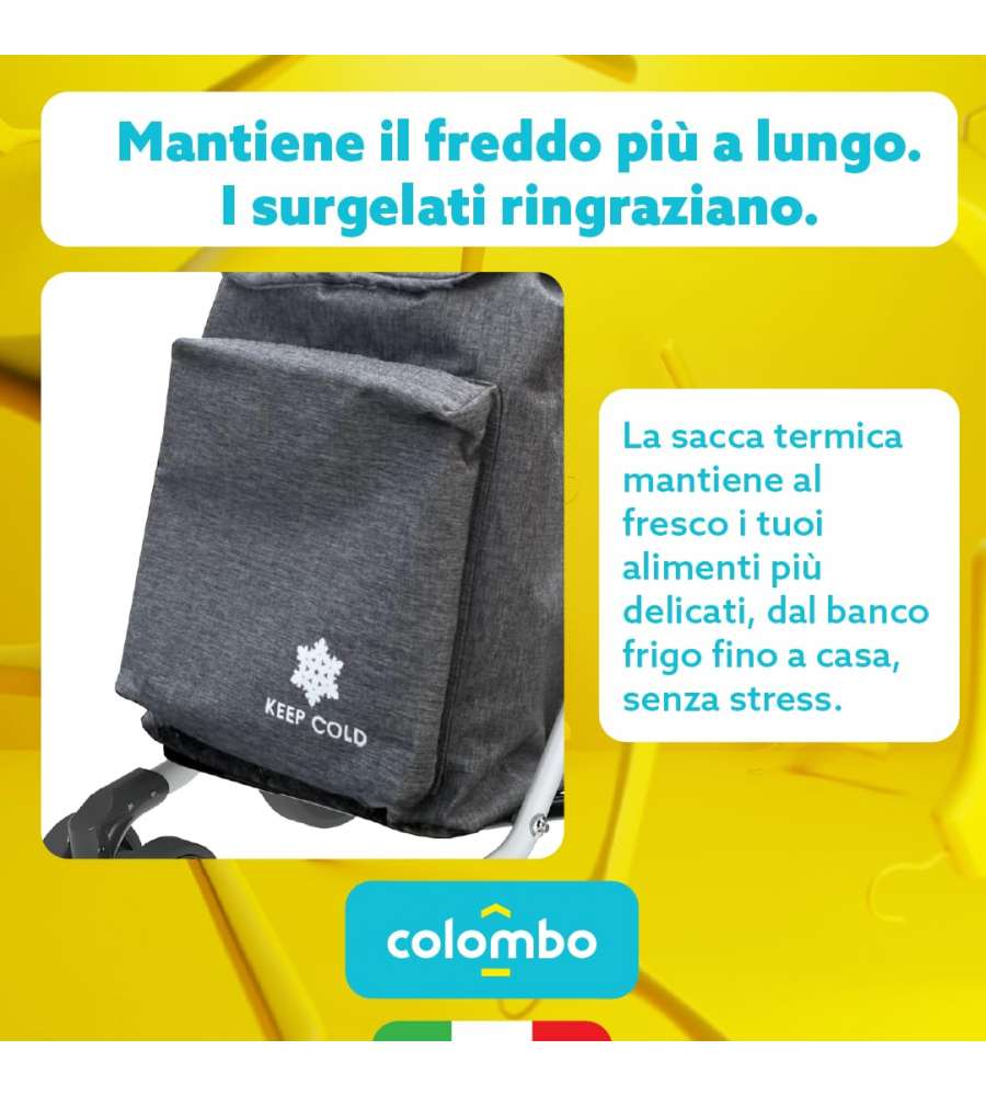 Descrizione: Carrello spesa Colombo in alluminio leggero, capacità 60L + 4L termica. Manico regolabile, 6 ruote manovrabili, pieghevole e compatto. Ideale per la spesa quotidiana, versatile e resistente.