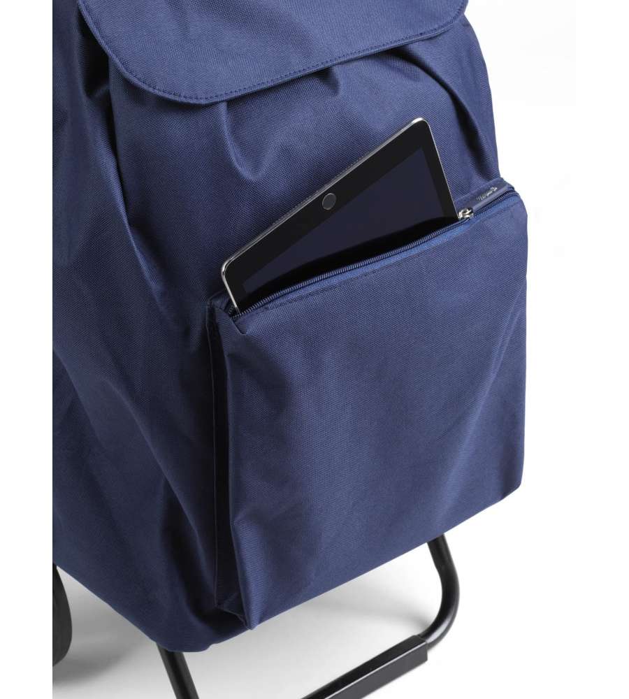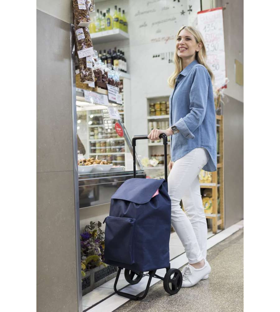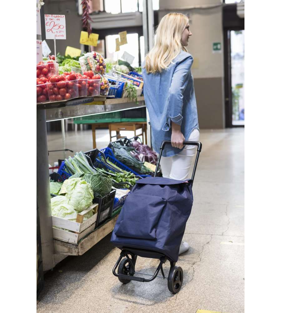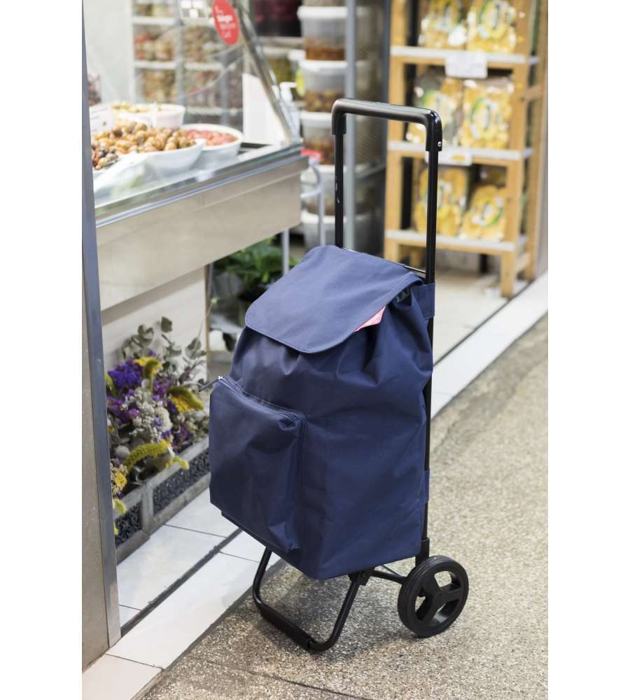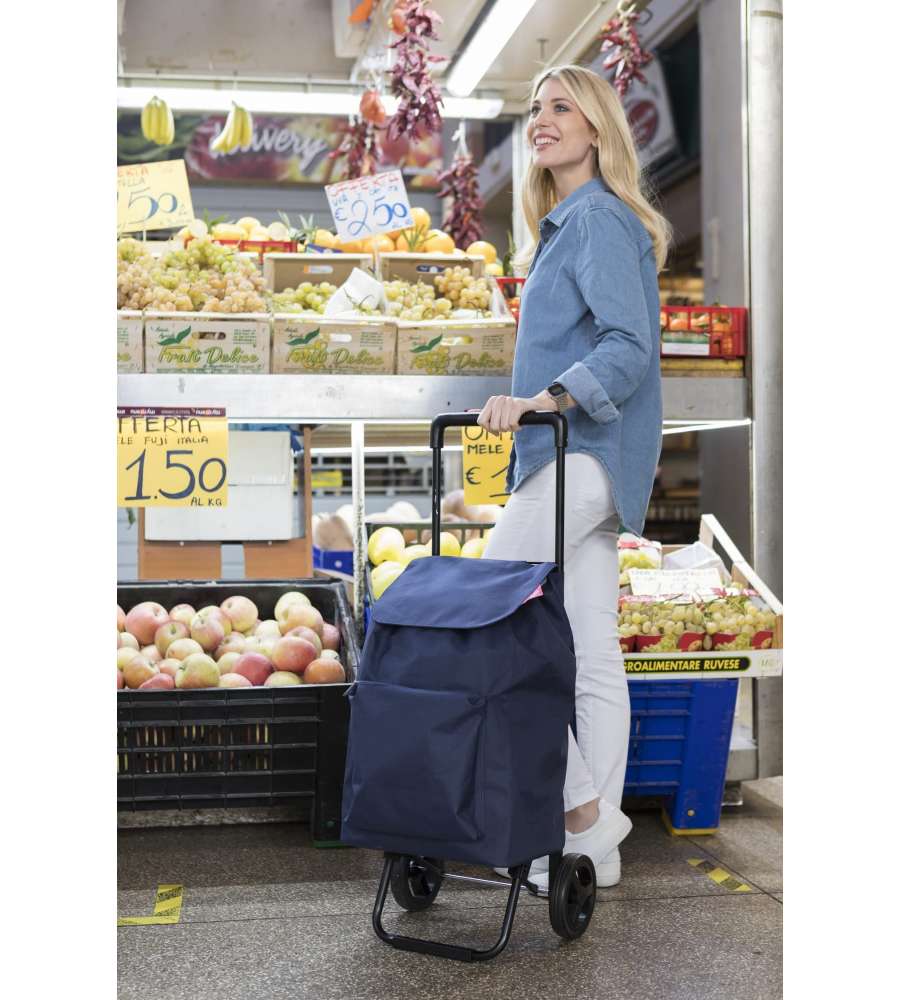 Descrizione: Carrello spesa Argo Blu Gimi, telaio in acciaio resistente e manico ergonomico in ABS. Sacca in poliestere estraibile da 42 litri, tasca anteriore con zip e ruote fisse per una mobilità agevole. Pieghevole e leggero (1,60 kg).