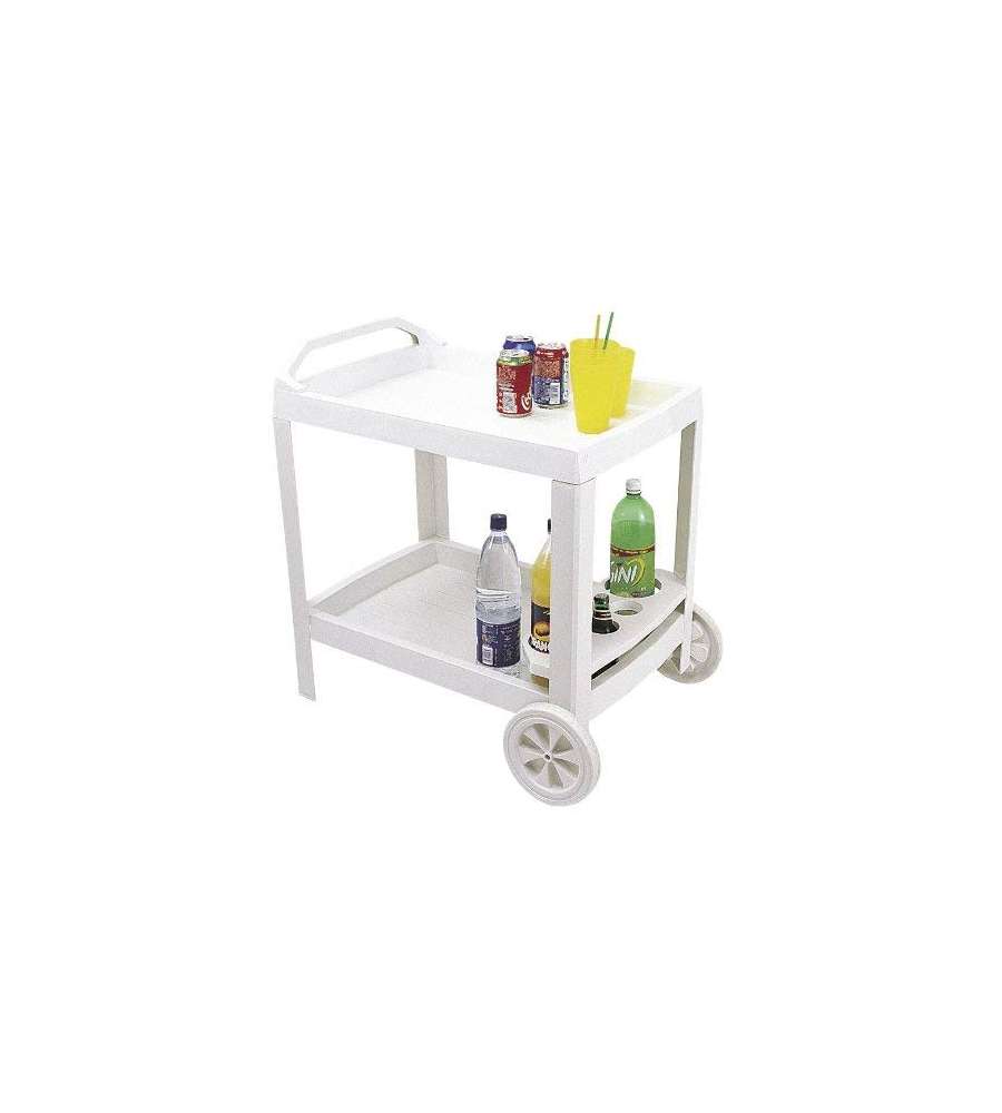 Carrello in resina bianca per bibite, dimensioni 74x53x73 cm, leggero (7,1 kg) e resistente agli agenti atmosferici, muffe e polvere. Dotato di ruote per facilità di movimento, non adatto a uso professionale. Montaggio richiesto.Uso esterno: