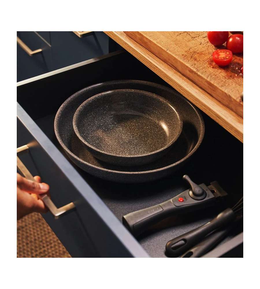 Padella in alluminio da 28 cm con spessore di 3,2 mm, rivestimento interno antiaderente Granitium e esterno effetto pietra. Adatta per induzione e tutte le fonti di calore. Opzione salvaspazio senza manico.