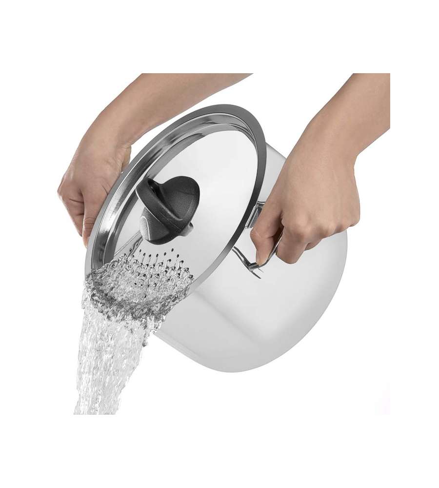 Cuociscola in acciaio inox 18/10 di 22 cm con coperchio semiforato e chiusura a baionetta. Adatta a tutte le fonti di calore (induzione esclusa), lavabile in lavastoviglie. Robusta e igienica, ideale per cuocere, scolare e condire. Garanzia 2 anni.Capacità: