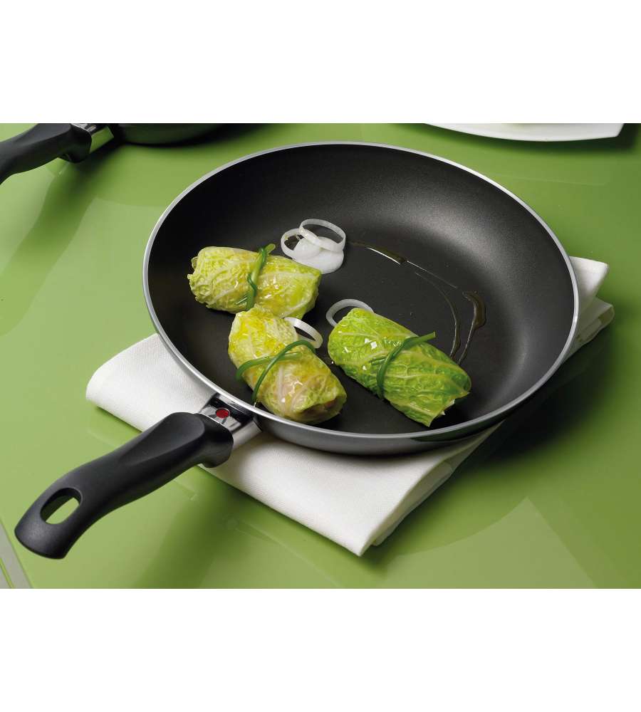 Padella 20 cm con rivestimento antiaderente Cortan, manico in bachelite e sistema Thermopoint per riconoscere la temperatura e cucinare in sicurezza. Resistente fino a 160°C. Adatta a tutte le fonti di calore escluse induzione.Indicato per: