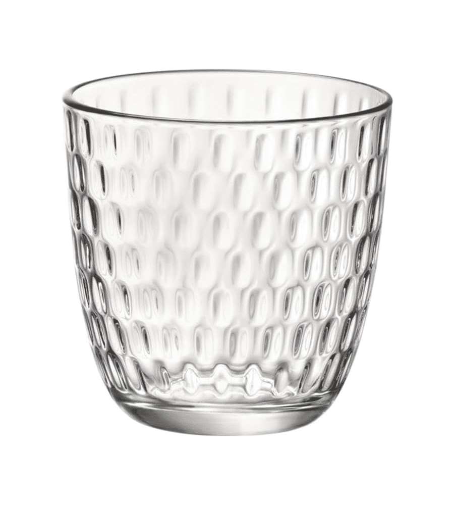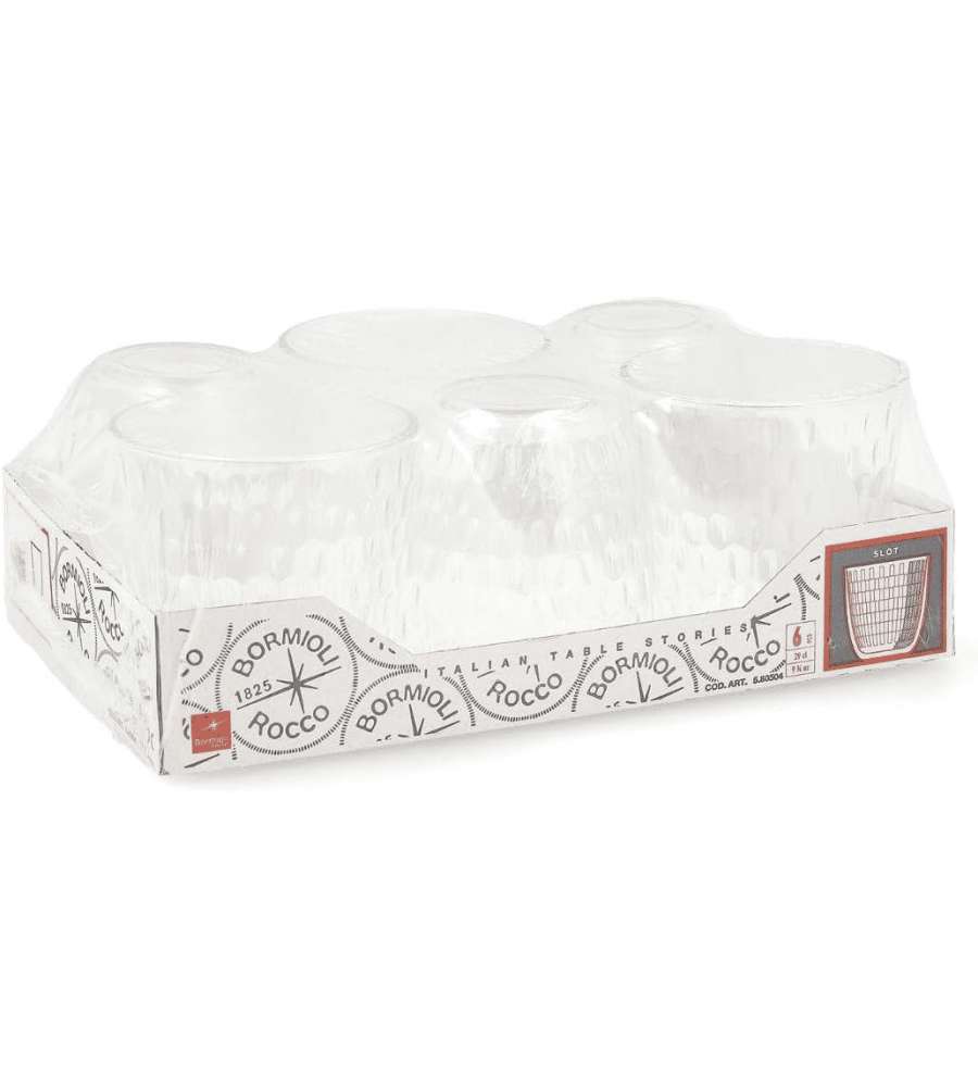 Set di 6 bicchieri Bormioli Slot, capacità 29 cl ciascuno. Realizzati in vetro robusto e trasparente, sono riutilizzabili e facili da pulire, anche in lavastoviglie. Design moderno e geometrico, ideali per bevande fredde.Capacità: