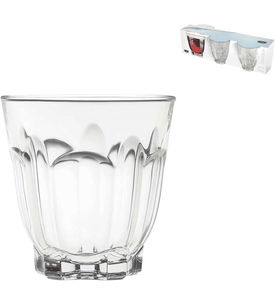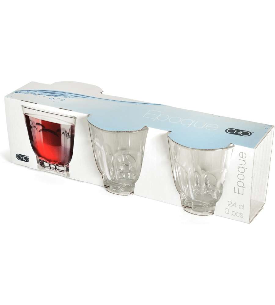 Descrizione: Set di 3 bicchieri Chio Epoque in vetro trasparente da 24 cl. Design moderno ed elegante, lavabili in lavastoviglie e adatti a ogni tavola. Dimensioni: 8,5x9 cm. Perfetti per l'uso quotidiano!
