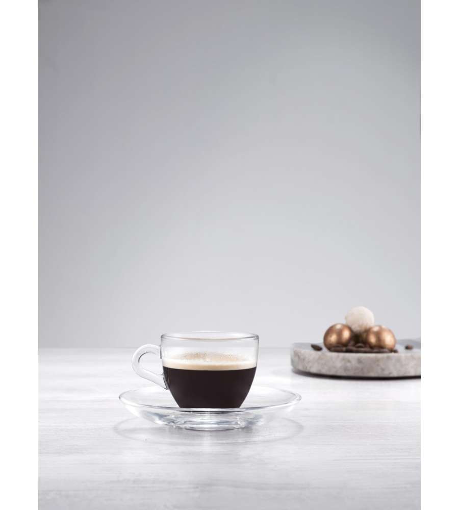 Descrizione: Set di 6 tazzine da caffè in vetro trasparente da 90 ml con piattini. Eleganti e resistenti, sono lavabili in lavastoviglie e perfette per ogni occasione. Gusta il tuo espresso con stile!