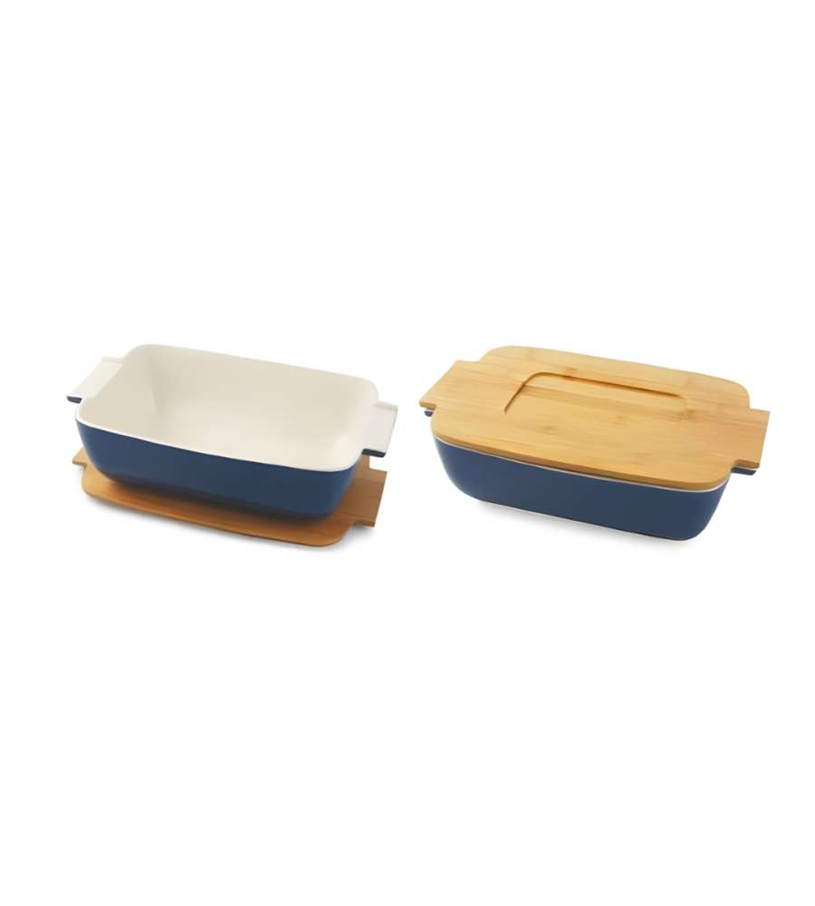 Terrina rettangolare in ceramica con coperchio in bambù, dimensioni 32 x 20 x 9 cm. Design elegante e funzionale, adatta al forno e lavabile in lavastoviglie. Ideale per preparazioni e presentazioni culinarie.Composizione: