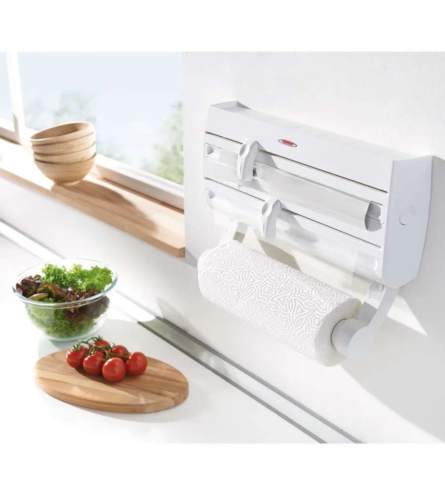 Il portarotoli a parete ha spazio per carta stagnola, pellicola trasparente e rotolo da cucina, e la parte superiore è stata dotata di bordi rialzati in modo che possa raddoppiare come portaspezie. Il portarotolo da cucina ha un freno di rotolamento integrato per facilitare lo strappo di fogli singoli. Rimuovere l'alloggiamento in plastica, posizionare i rotoli e il portarotolo fissato al muro è pronto per l'uso. È adatto a tutte le dimensioni di rotoli in commercio (rotoli e spezie non inclusi).