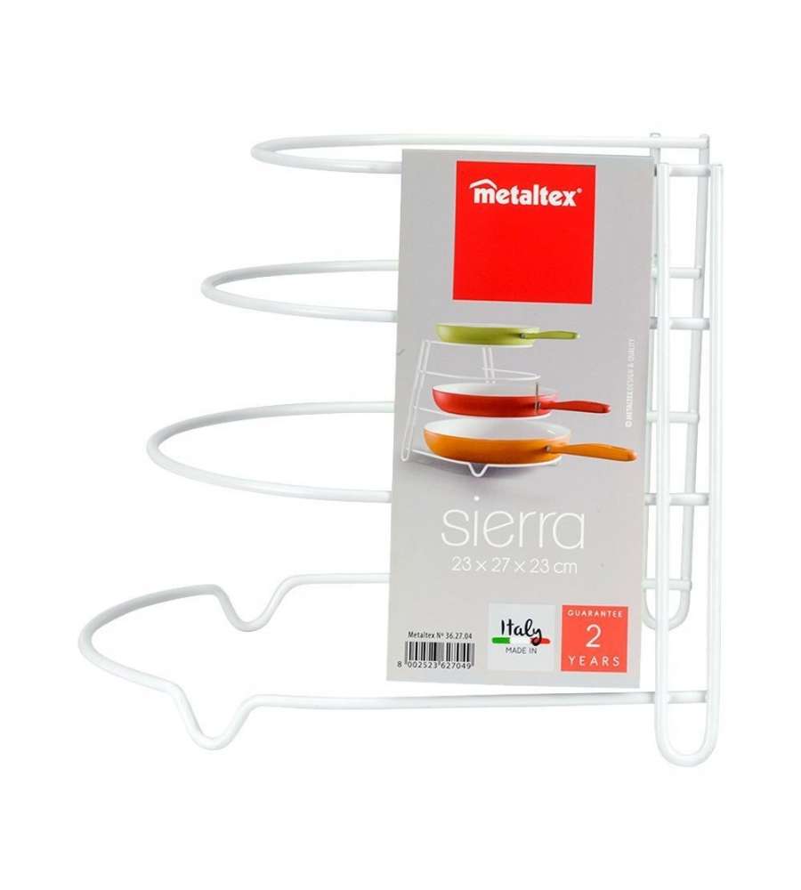 Descrizione: Mensola Basic Sierra di Metaltex, porta tegami a 4 posti in ferro plastificato antiruggine. Design moderno e pratico, ideale per tenere ordinate le padelle. Dimensioni compatte: 23x27x23 h cm.