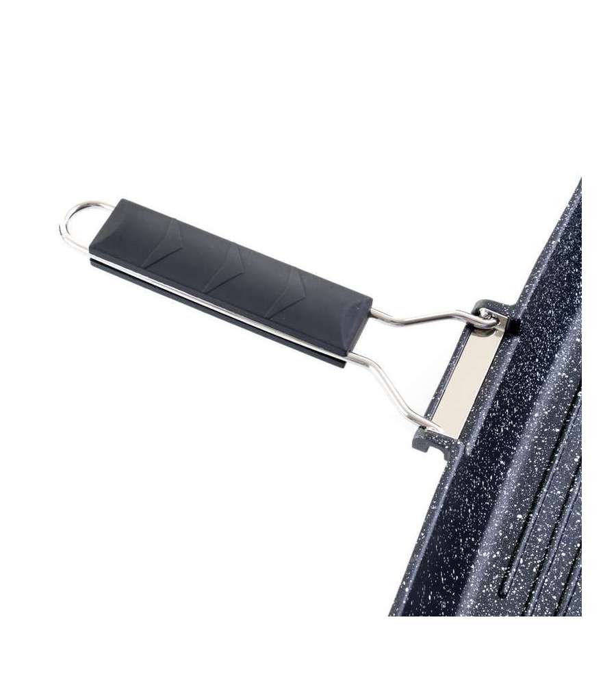 Rivestimento antiaderente in stone, manico pieghevole per risparmiare spazio, superficie rigata per una cottura uniforme. Ideale per grigliare carne, pesce e verdure, perfetta per uso interno ed esterno. Facile da pulire.Indicato per: