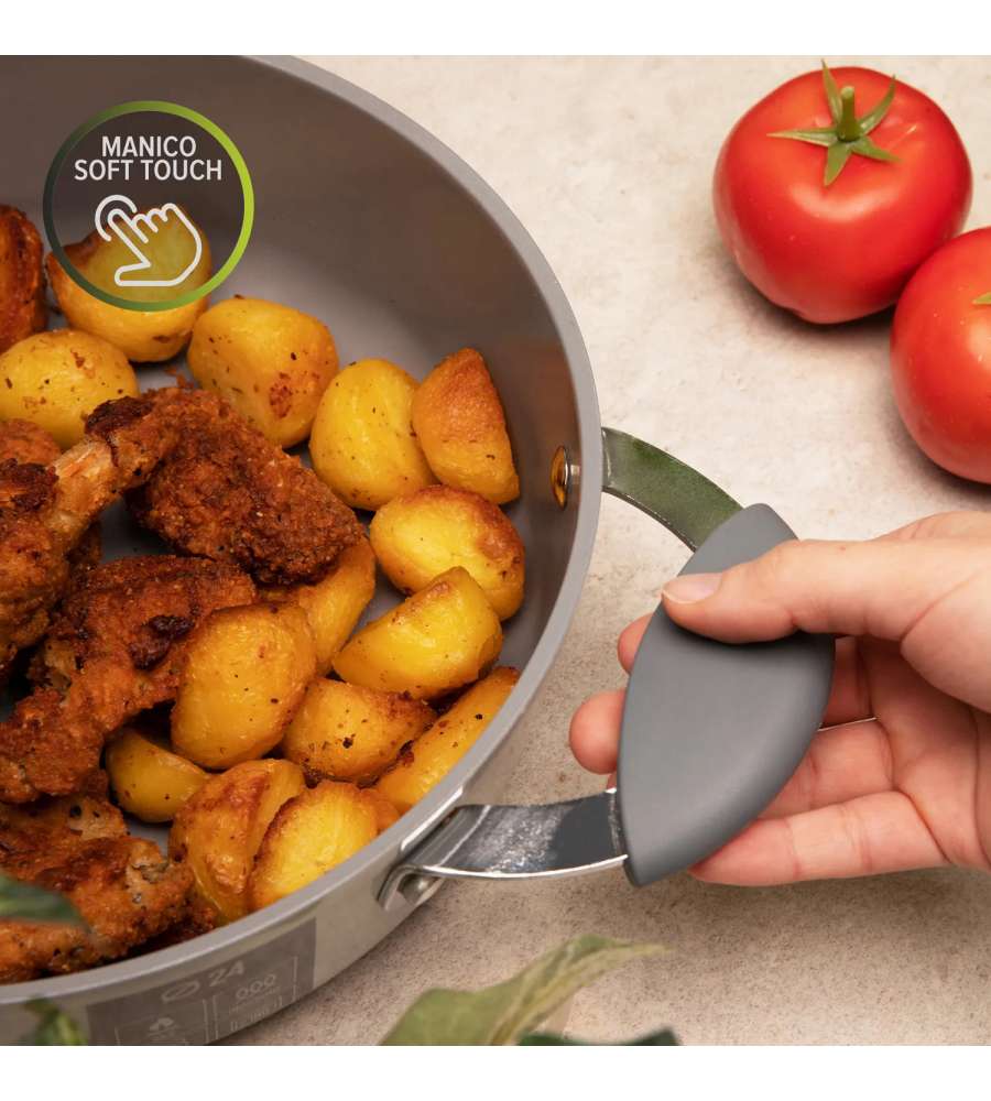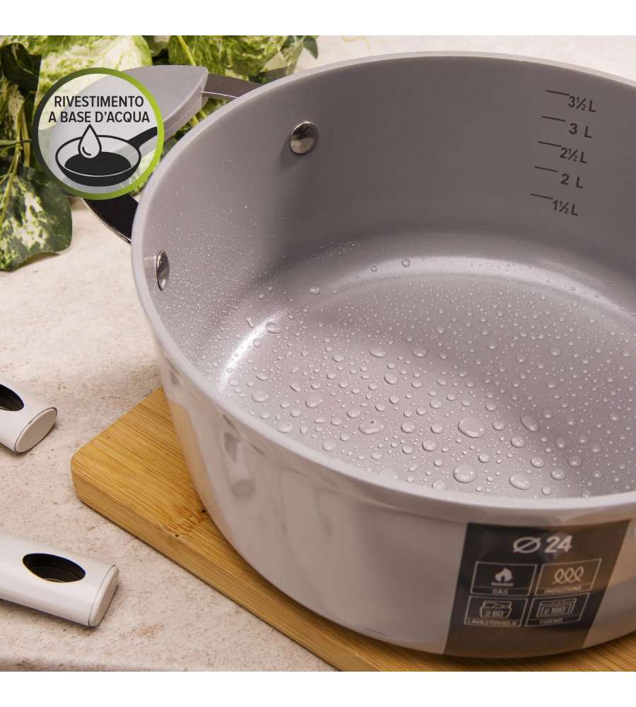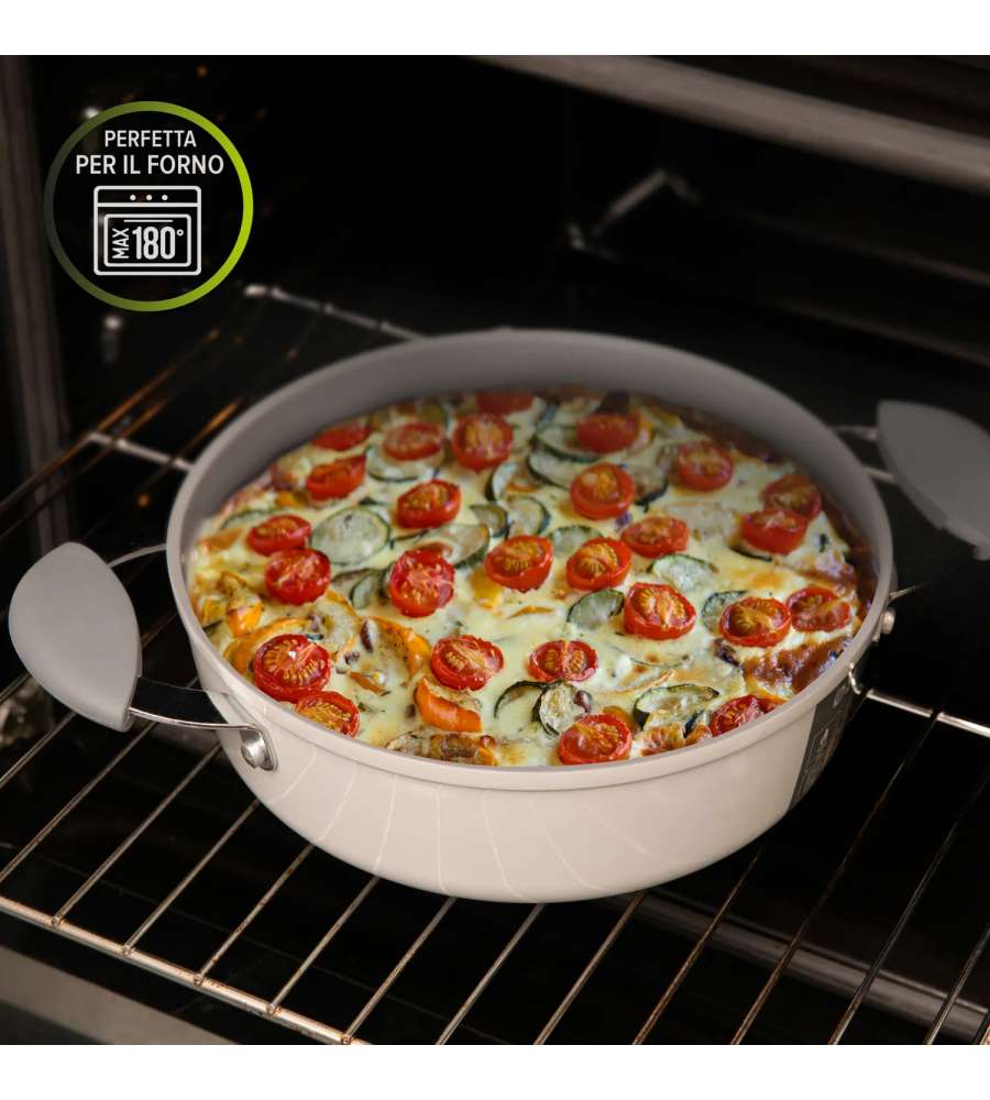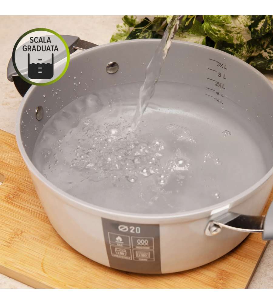 Casseruola antiaderente da 20 cm con coperchio in vetro temperato, corpo in alluminio per cottura veloce, fondo full induction e rivestimento ceramico a base d'acqua. Manici in silicone, lavabile in lavastoviglie e uso in forno fino a 180°C.Capacità: