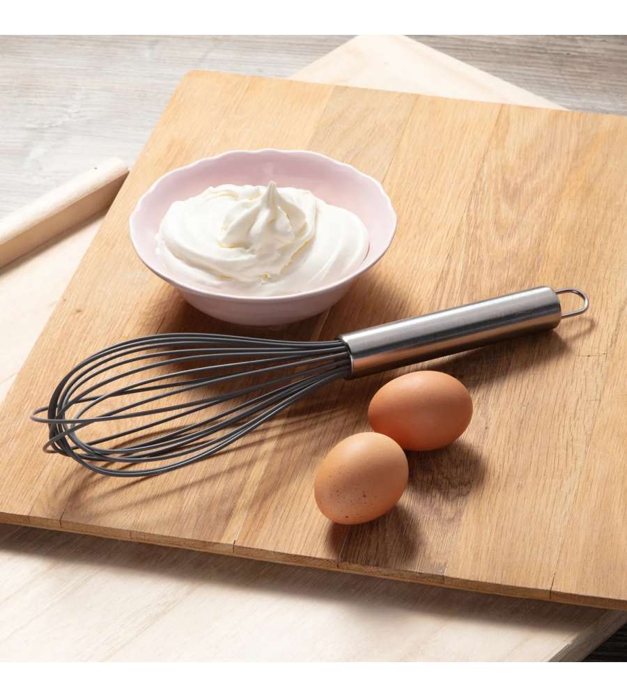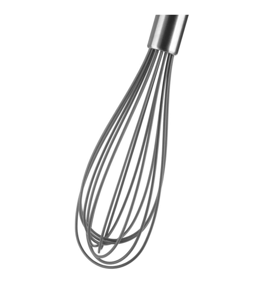 Frusta in silicone da 32 cm con manico in acciaio inox 430, priva di nichel. Ideale per montare panna, albumi e impasti, non graffia rivestimenti antiaderenti. Lavabile in lavastoviglie, inodore e igienica, con foro per appenderla.Composizione: