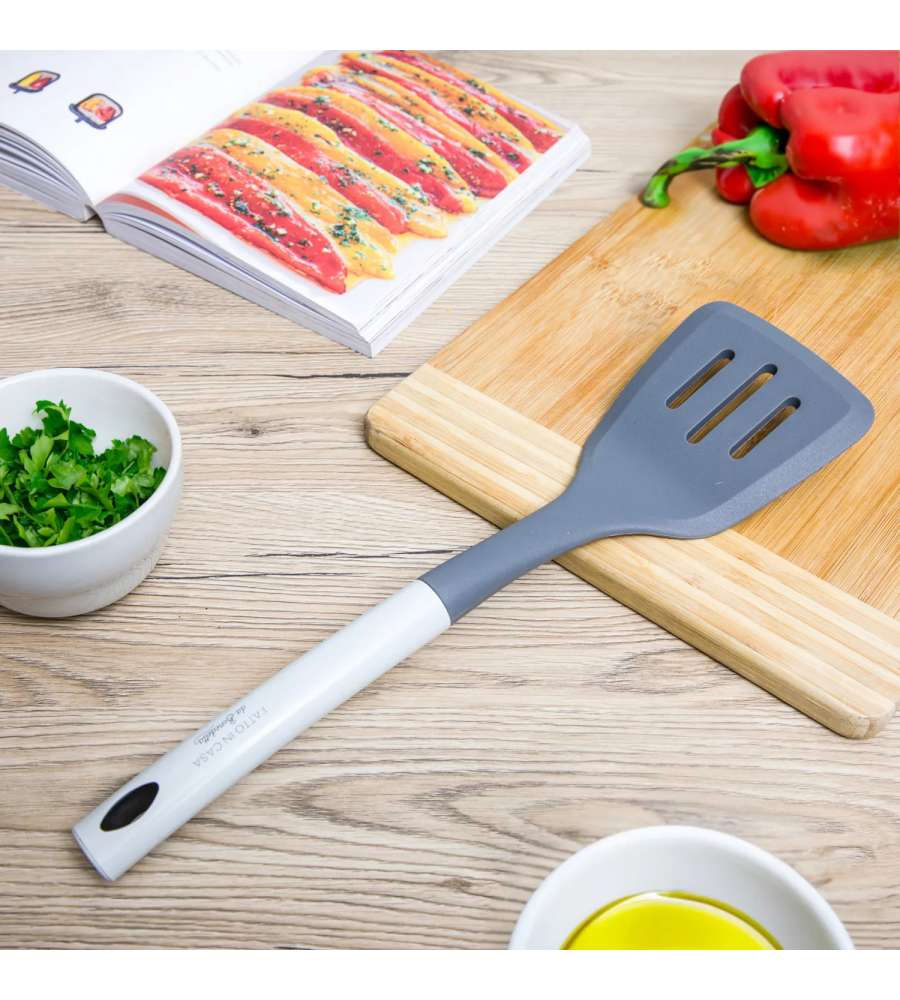 Descrizione: Paletta forata in silicone 34 cm di Fatto in casa da Benedetta, ideale per girare frittate e hamburger senza graffiare le padelle antiaderenti. Manico in acciaio inox, lavabile in lavastoviglie.