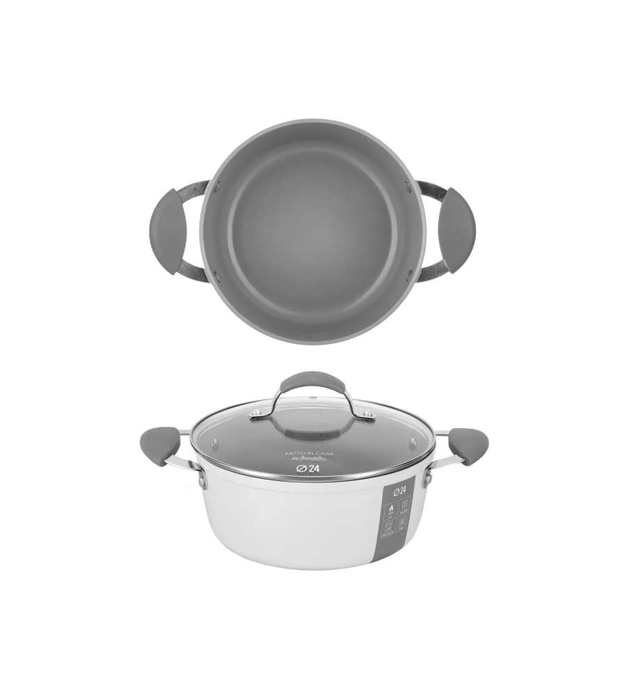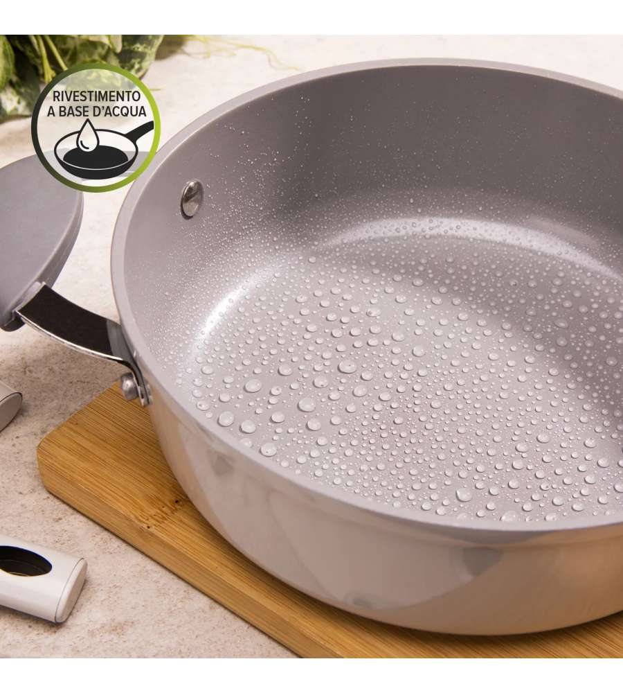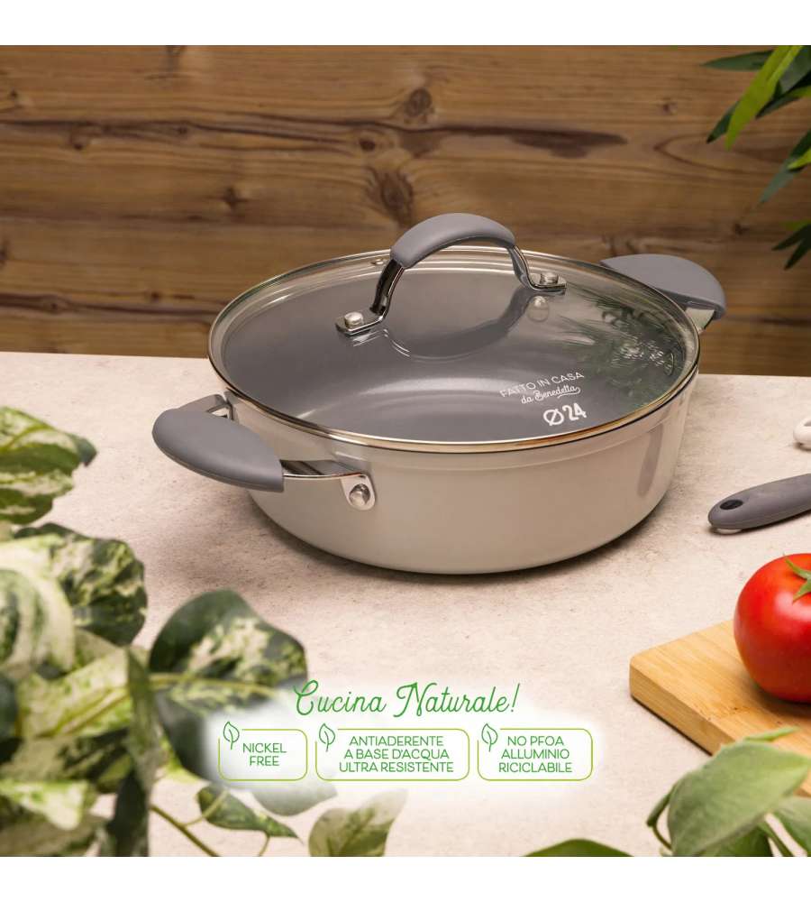Tegame antiaderente da 24 cm con coperchio in vetro temperato, fondo full induction per una cottura veloce e uniforme. Rivestimento ceramico a base d'acqua, manici in silicone, lavabile in lavastoviglie e adatto per il forno fino a 180 °C.Capacità: