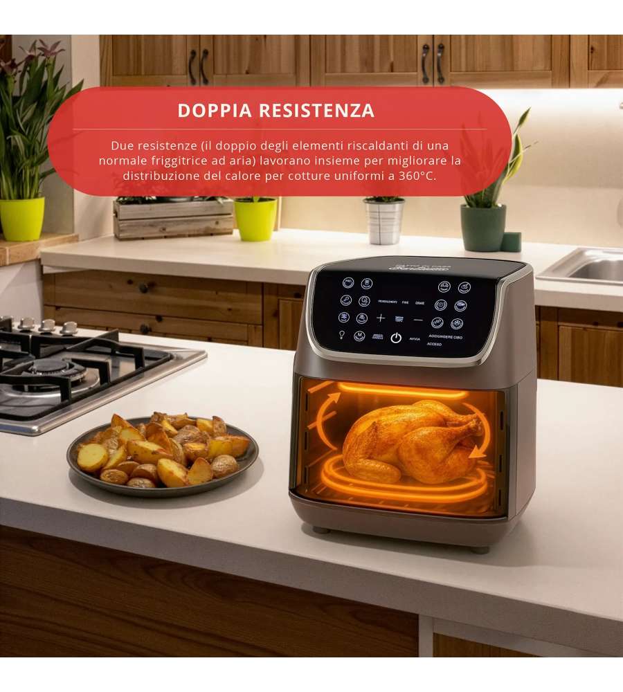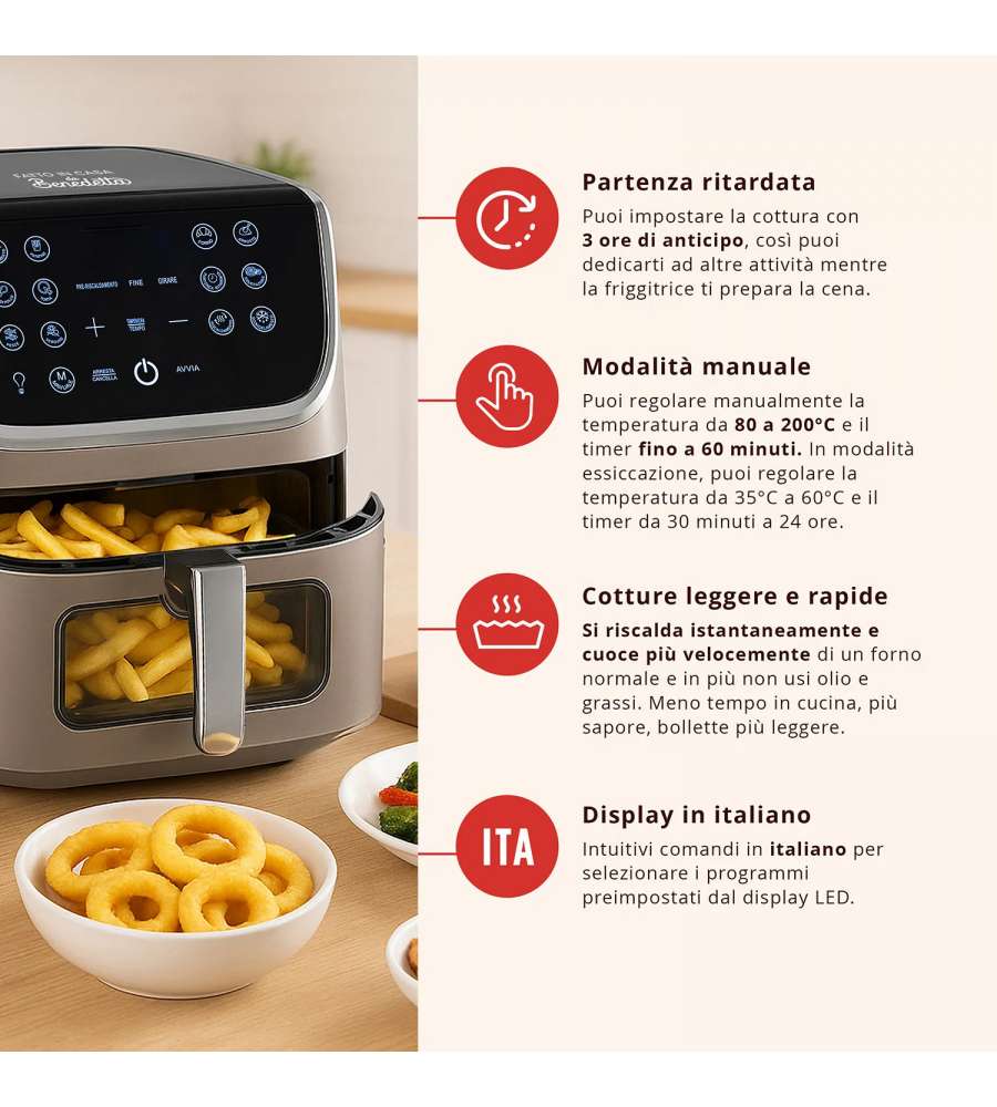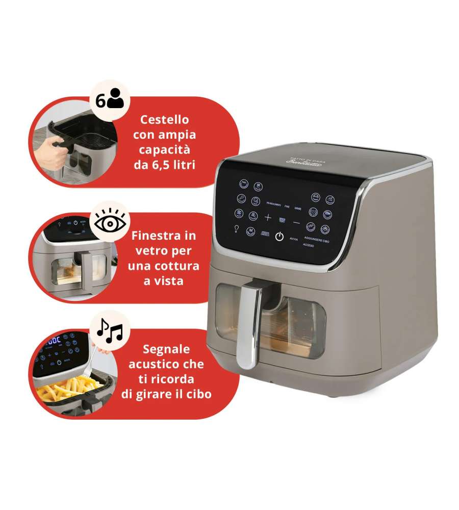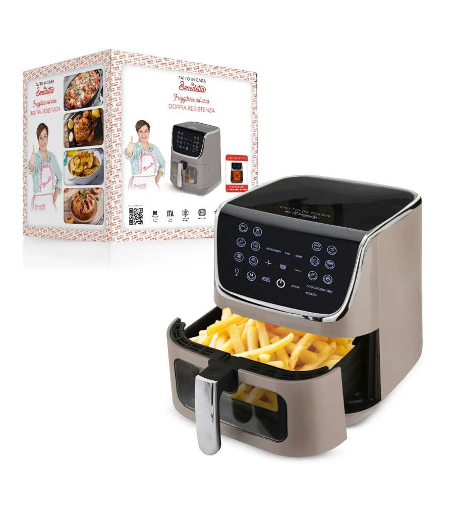 Descrizione: Scopri la friggitrice ad aria doppia resistenza da 6,5 L di FATTO IN CASA da Benedetta, perfetta per cotture uniformi di dolci e panificati. 13 programmi intuitivi, partenza ritardata e finestra di controllo!
