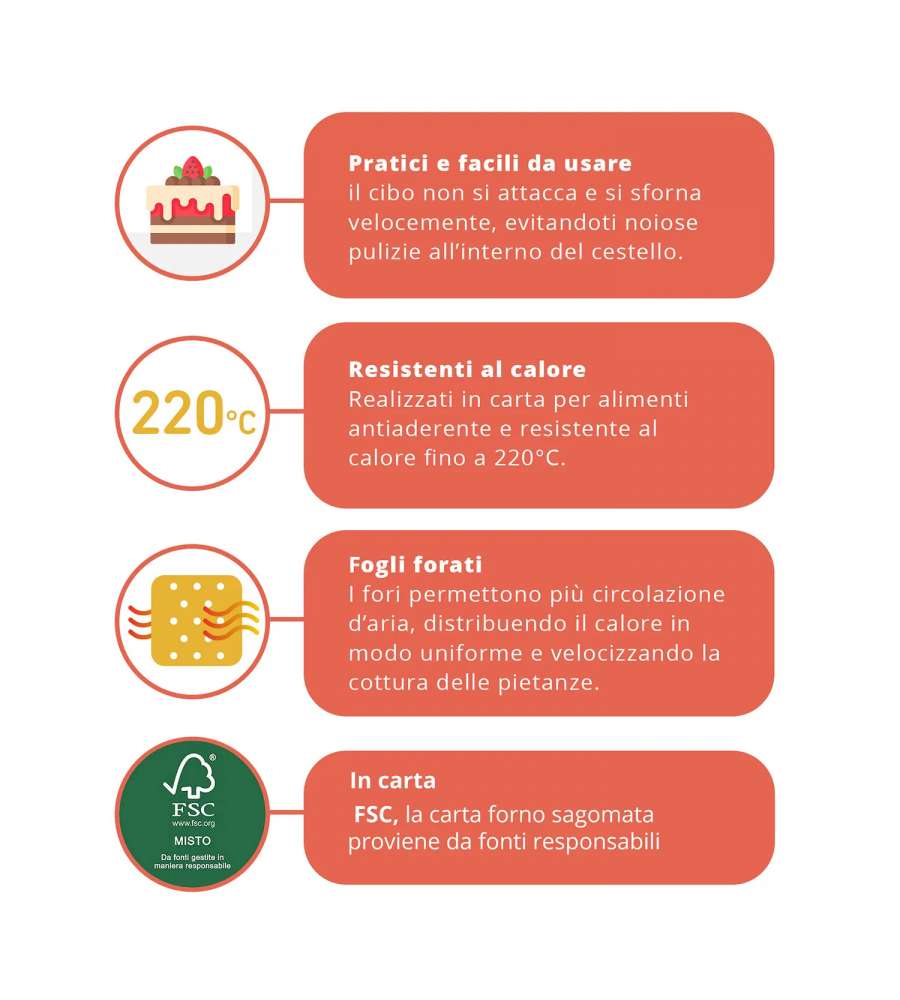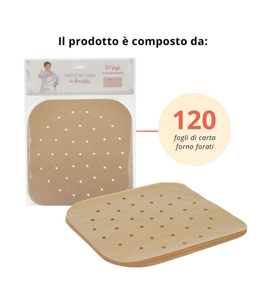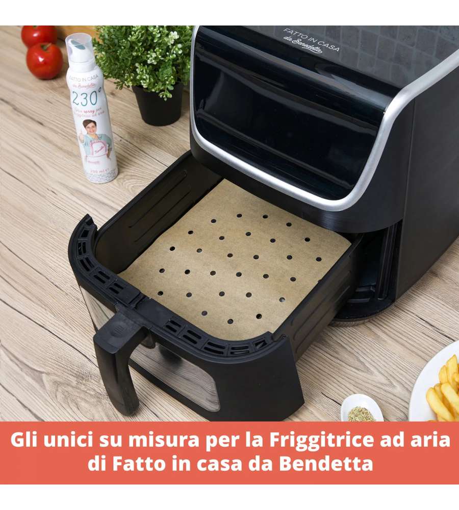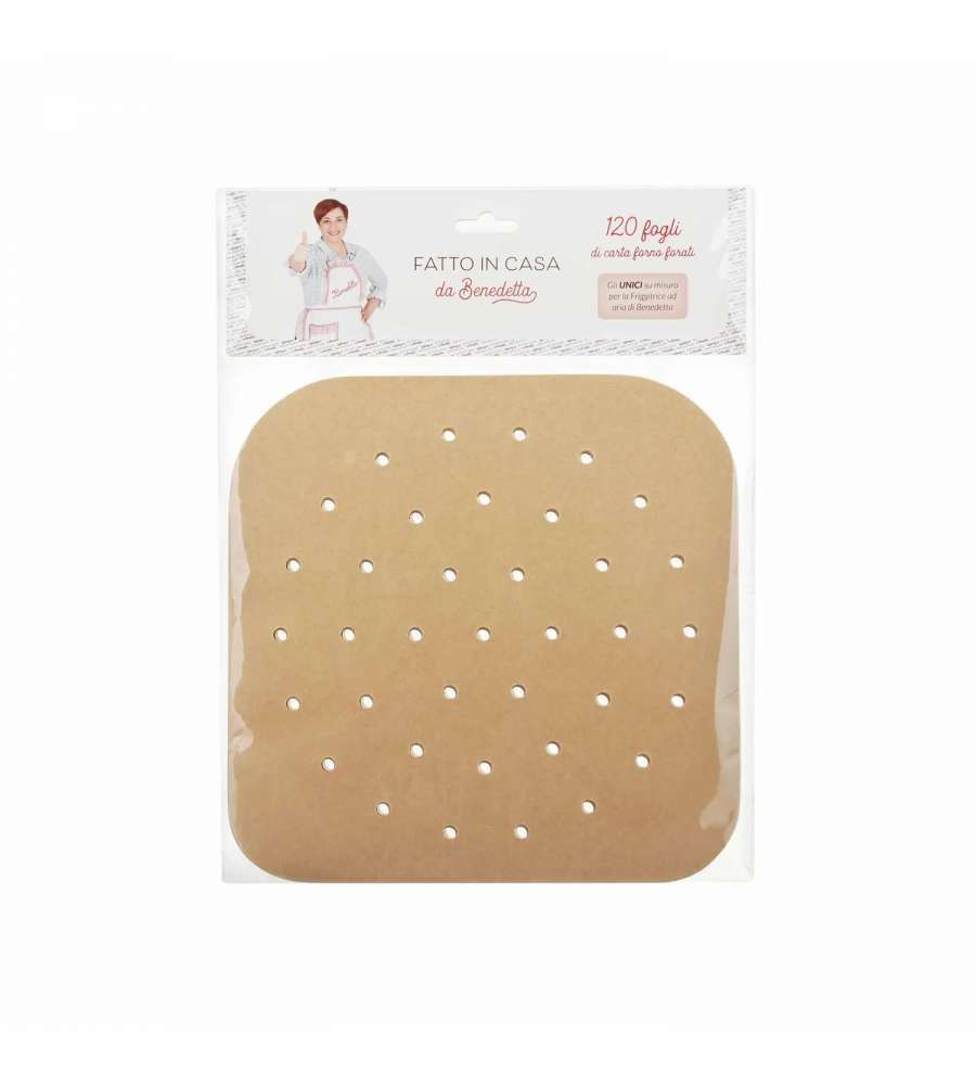 Descrizione: Kit di 120 fogli forati, gli unici su misura per la friggitrice ad aria di Benedetta! Dimensioni 24x24 cm, antiaderenti e resistenti fino a 220°C. Ideali per cottura veloce e pulizia facile!