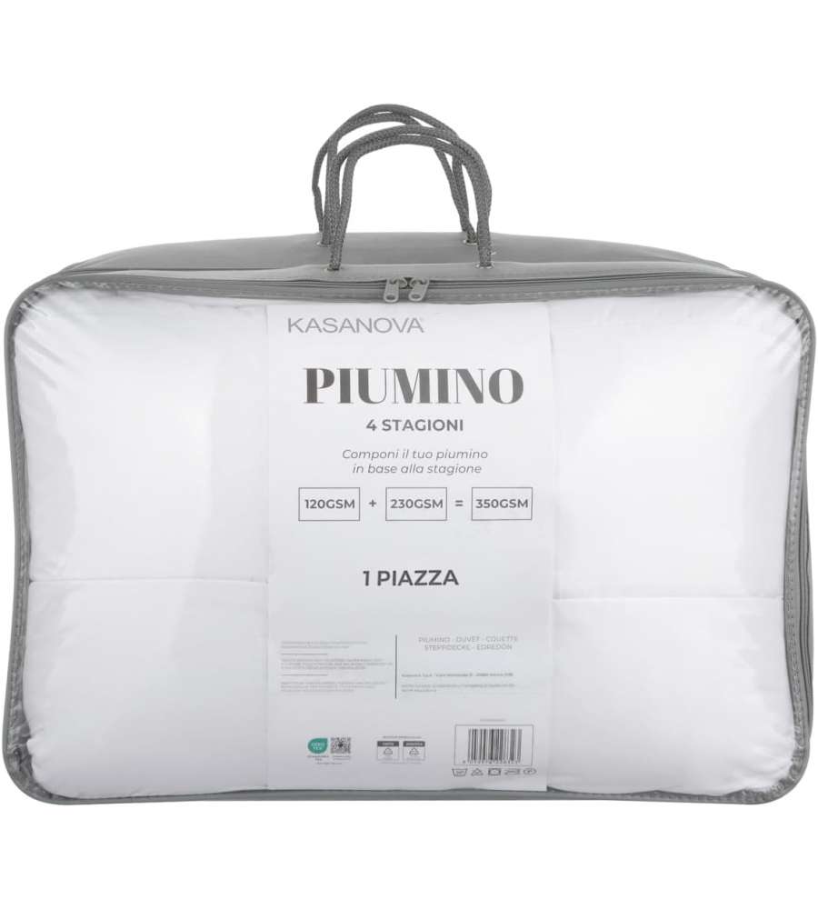 Piumino singolo 4 stagioni in bianco, composto da due piumini: 120 g/m² per l'estate e 230 g/m² per l'autunno. Uniscili per un comfort invernale a 350 g/m². Dimensioni copripiumino: 155 x 200 cm. Morbido e versatile.Composizione: