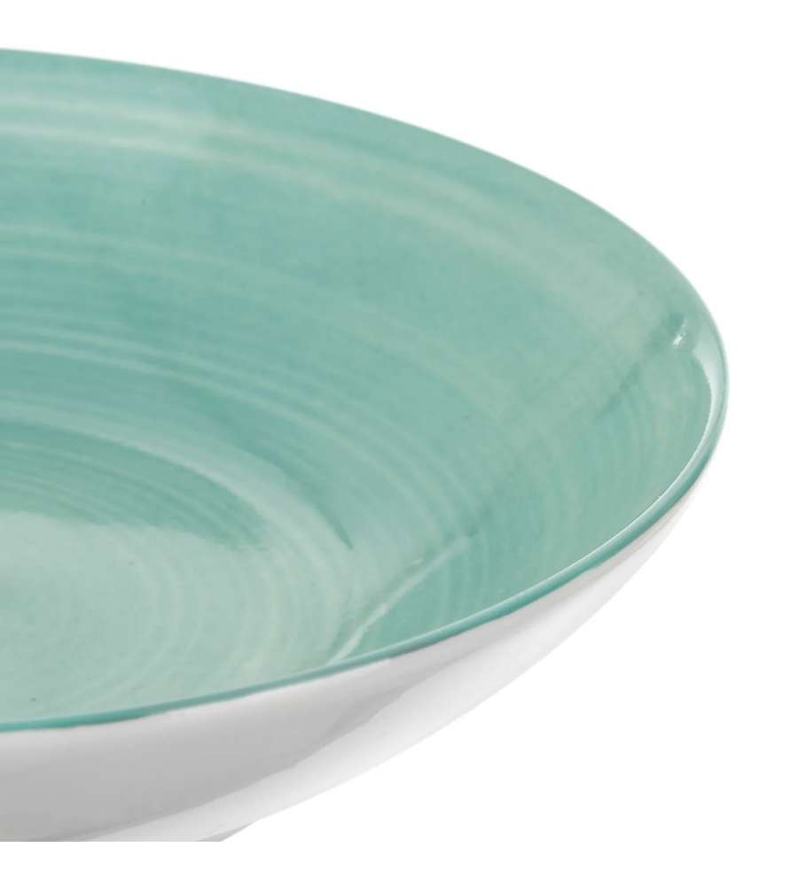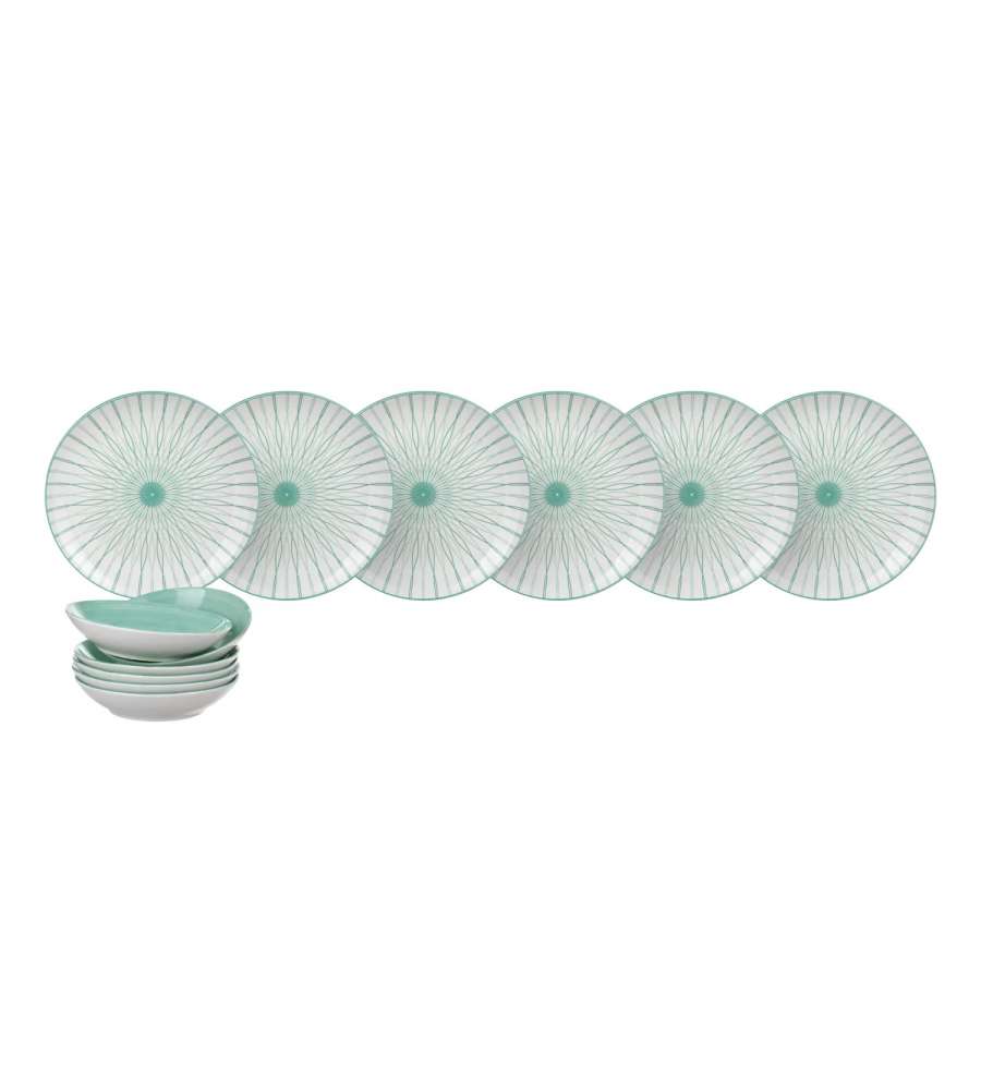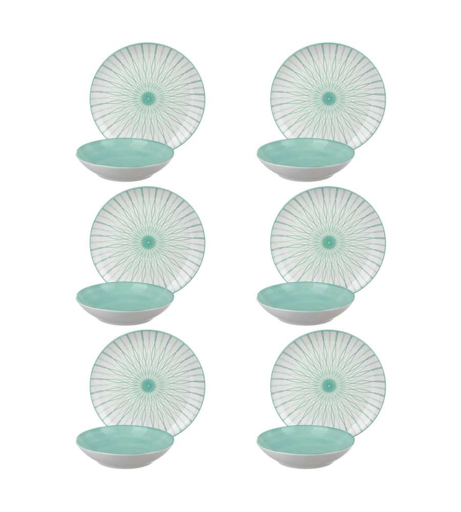 Descrizione: Servizio da 12 piatti in porcellana Hipnotic, decorati in tonalità ottanio. Include 6 piatti piani (26,5 cm) e 6 piatti fondi (21 cm). Lavabile in lavastoviglie e adatto al microonde, ideale per 6 persone.