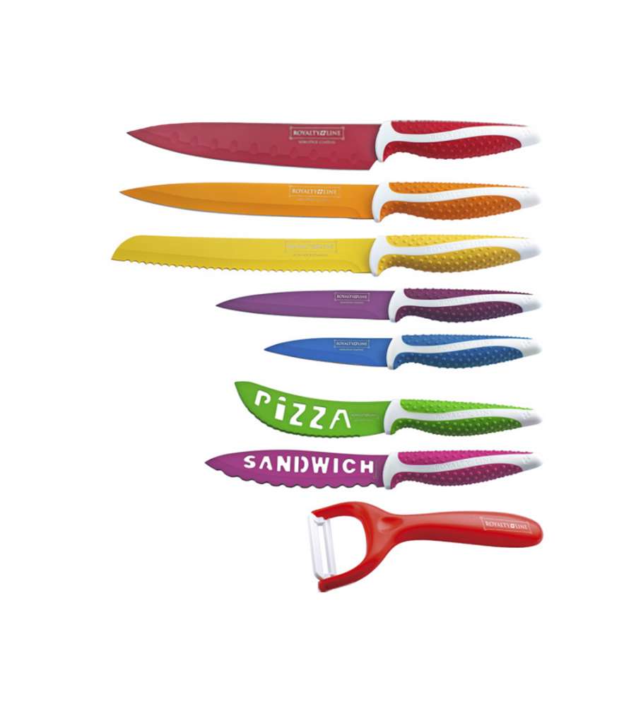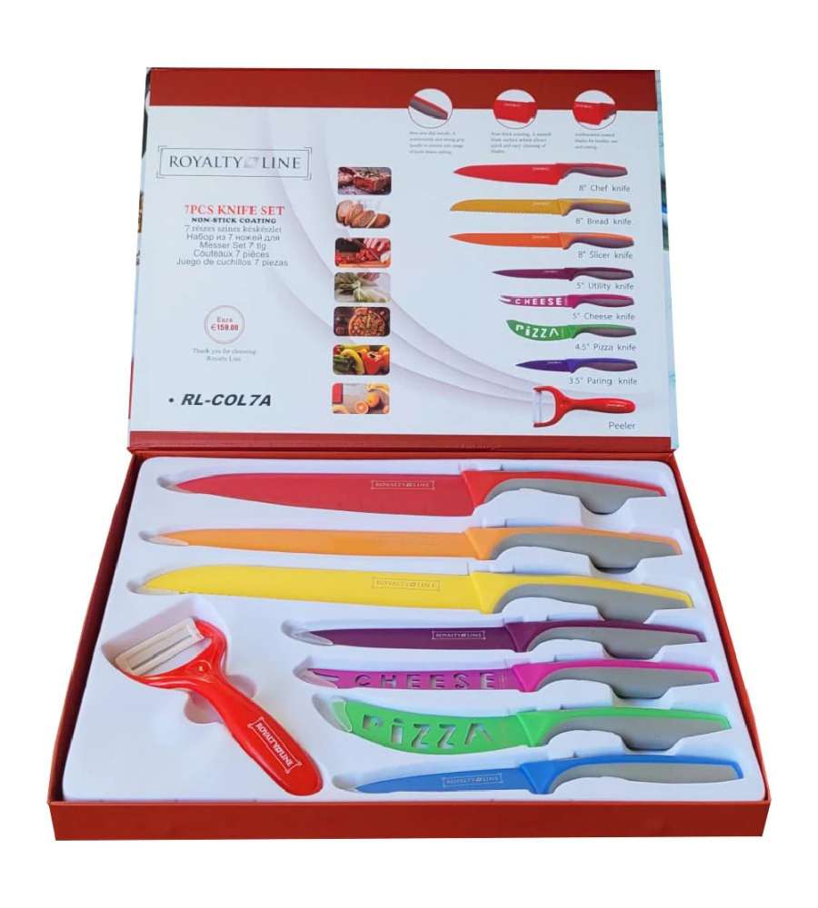 Descrizione: Scopri il Set 7 Coltelli Colorati Royalty Line: lame in acciaio antiruggine affilate, rivestimento antiaderente e manici antiscivolo. Perfetti per ogni cucina, incluso pelapatate.