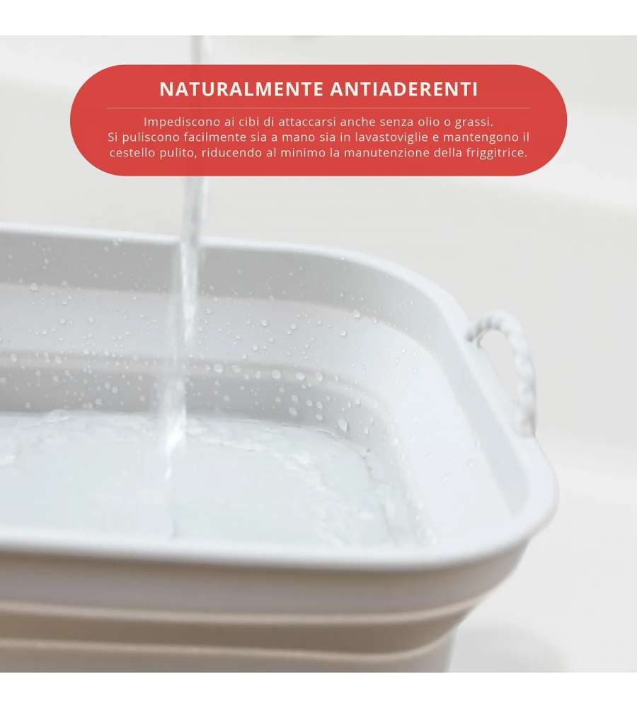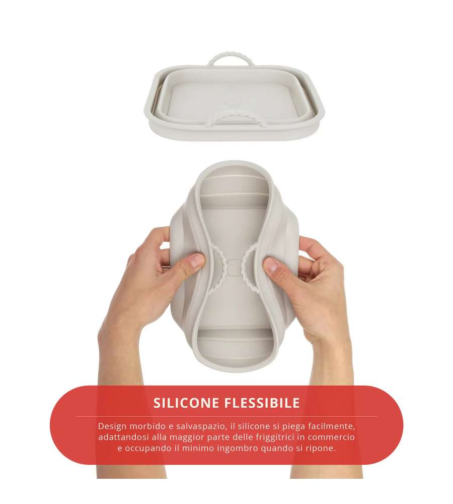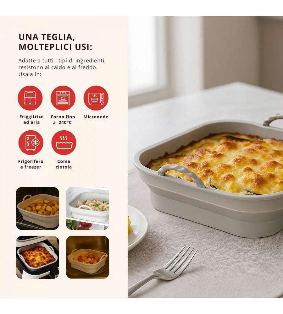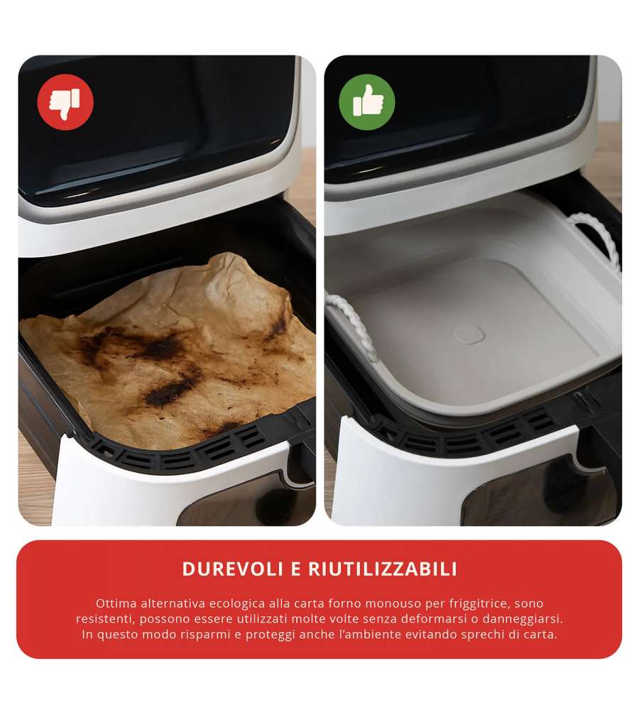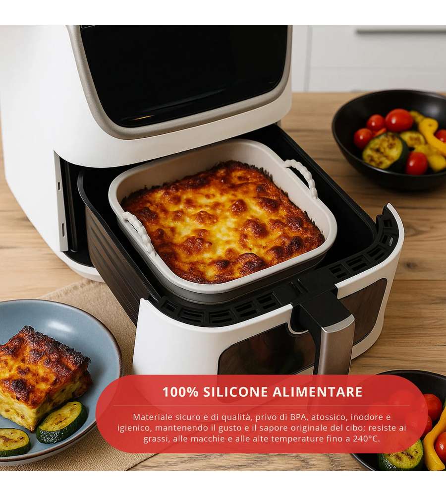 Teglia in silicone flessibile e antiaderente, adatta per friggitrice ad aria, forno (fino a 240°C), microonde, frigo e freezer. Riutilizzabile, ecologica, lavabile in lavastoviglie e resistente, occupa minimo spazio.Indicato per: