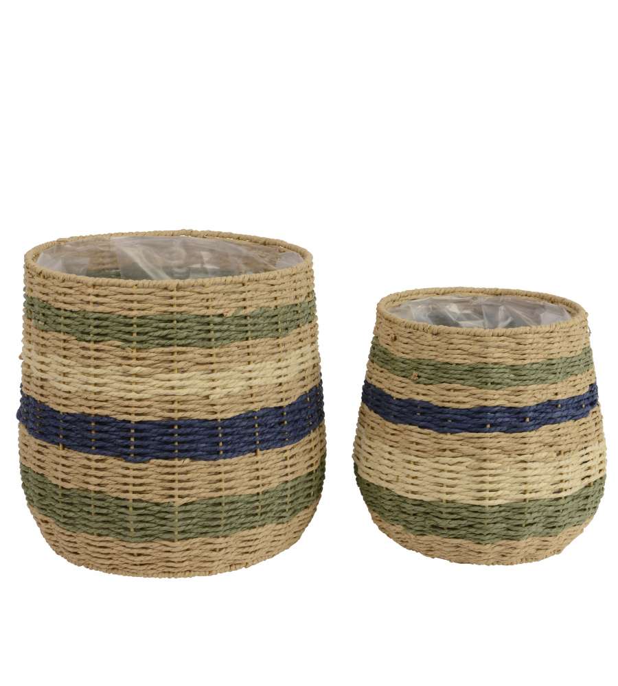Cesta rotonda in corda intrecciata con manico, ideale per interni. Design a righe nei colori naturale, verde e blu. Dimensioni compatte: 27x25 cm, perfetta per organizzare spazi e aggiungere un tocco decorativo.Uso interno: