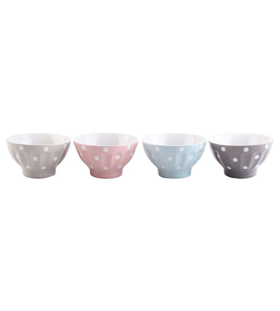 Scodella in porcellana con design a pois, lavabile in lavastoviglie e adatta per l'uso in microonde. Colori assortiti, ideale per la colazione. Dimensioni 16 cm di diametro, leggera con peso di 0,375 kg. Funzionalità moderna e pratica.Capacità: