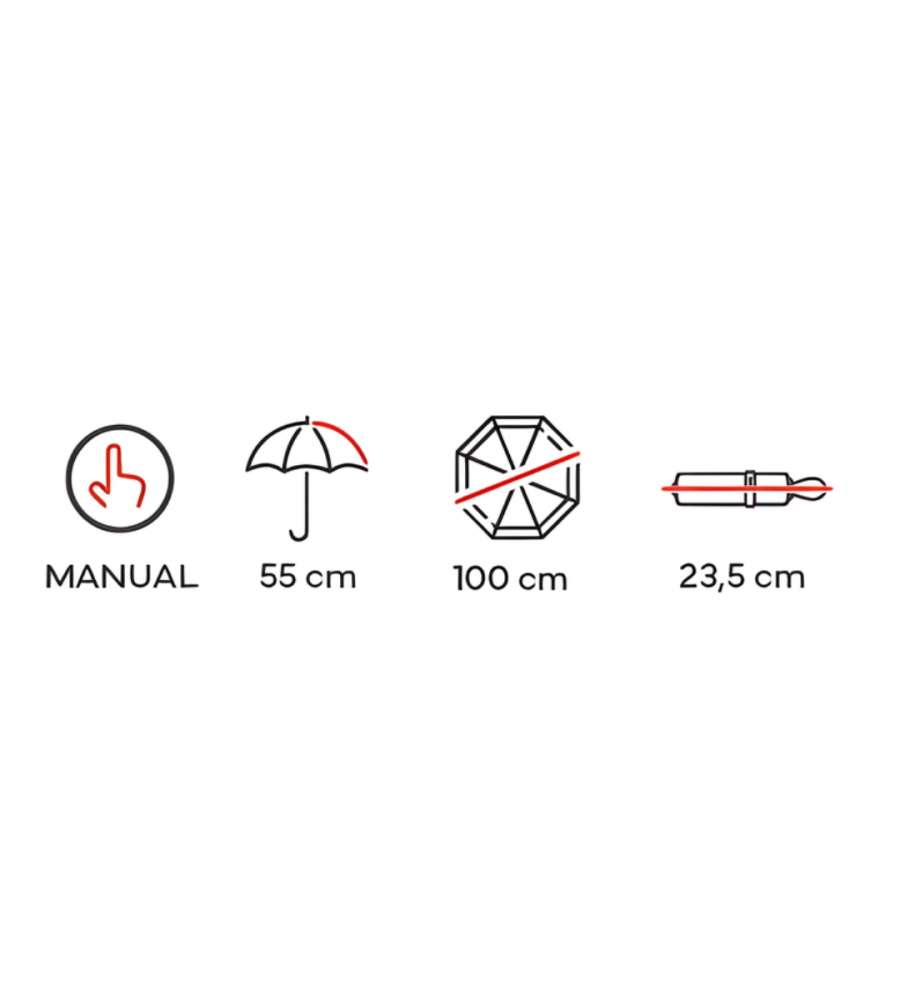 Ombrello pieghevole manuale con 8 stecche in fibra di vetro. Tessuto in poliestere, colore tinta unita. Diametro aperto 100 cm, chiuso ha una lunghezza di 23,5 cm, include custodia. Manico dritto. Leggero e pratico.Indicato per:
