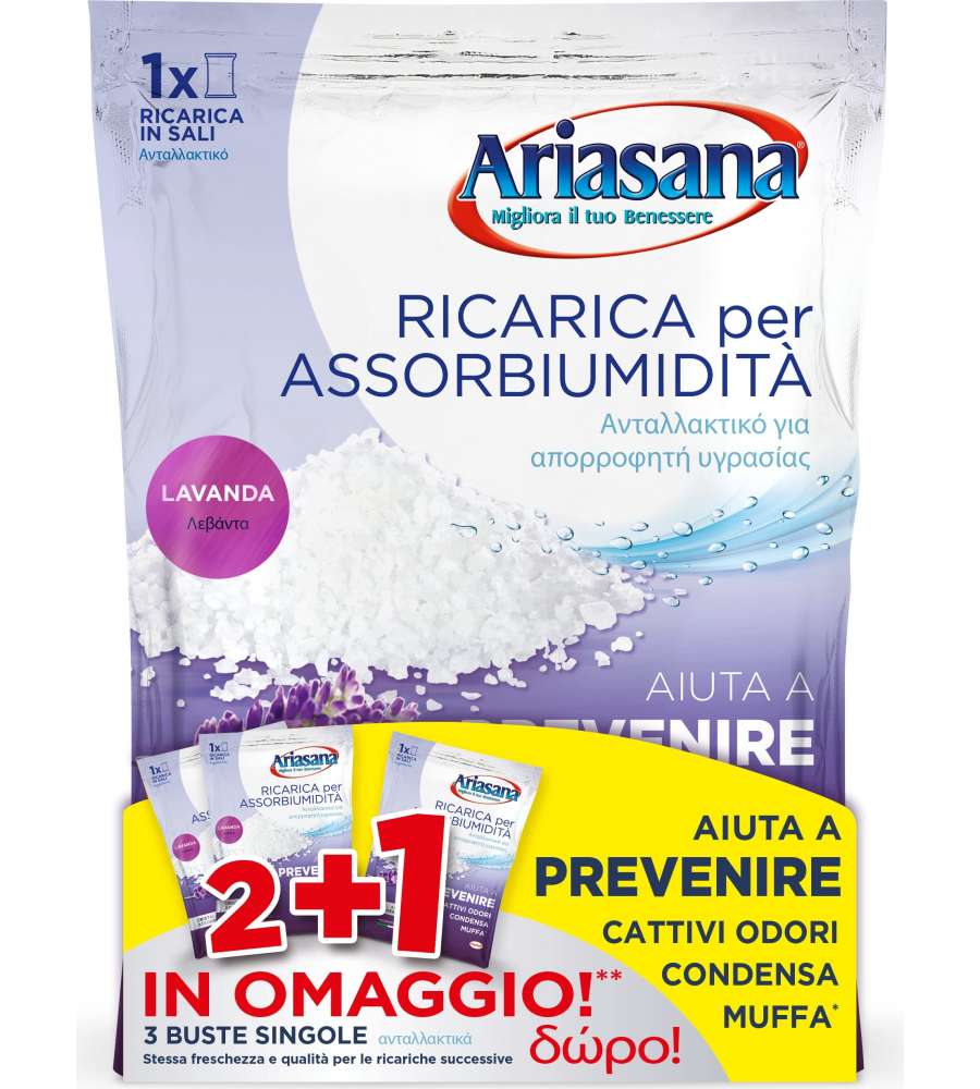 Descrizione: Ricarica Ariasana Lavanda 2+1 omaggio, cristalli assorbiumidità ad alto assorbimento. Efficace contro umidità e cattivi odori. Confezione da 3 x 450 g, ideale per ambienti umidi. Profumo fresco e duraturo.